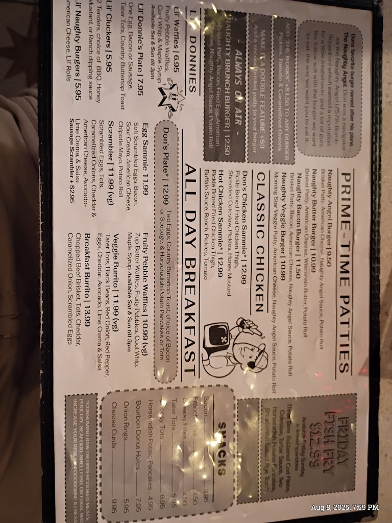 Arrived at 4:15 pm for a friday evening Birthday group of five. Reserved our group thru Opentable reservation app. The restaurant was already full. We made it right under the $5 old fashioned drink happy hour. Decent drink for the price. Simple limited menu burgers, breakfast items, fried chicken, and a variety of appetizers. We order 4 appetizers tater tots, bourbon donutholes, 2 onions rings. The donut holes were comped for birthday 🎂. Our group ordered 2 naughty smash burgers, 1 Don's fried chicken sandwich, 2 friday fish fry, 4 sides apps and a couple custom milk shakes, one was a boozy shake. We were pleased with all the food. Bill with tip averaged $40 per person including 1 alcoholic drink for each of us. Atmosphere was fun, very pop culture 60s-90s. A place to take 1st timers or visitors. Service was good. Noise could be a factor for some.