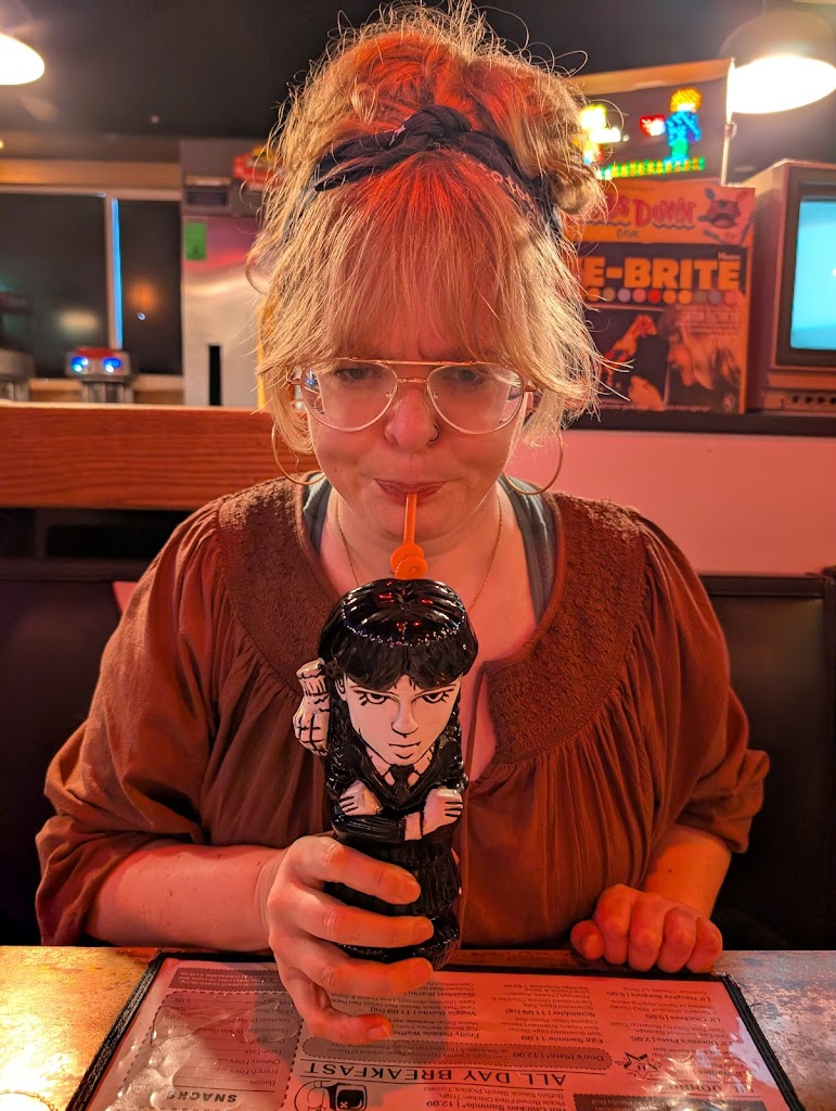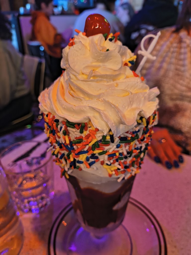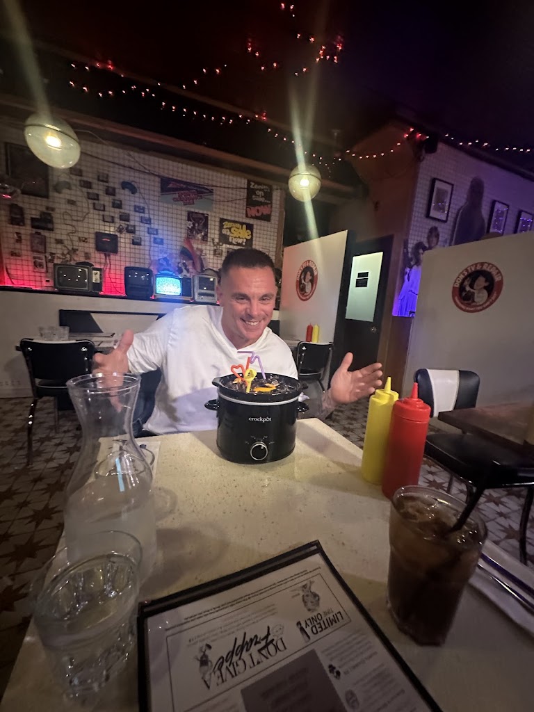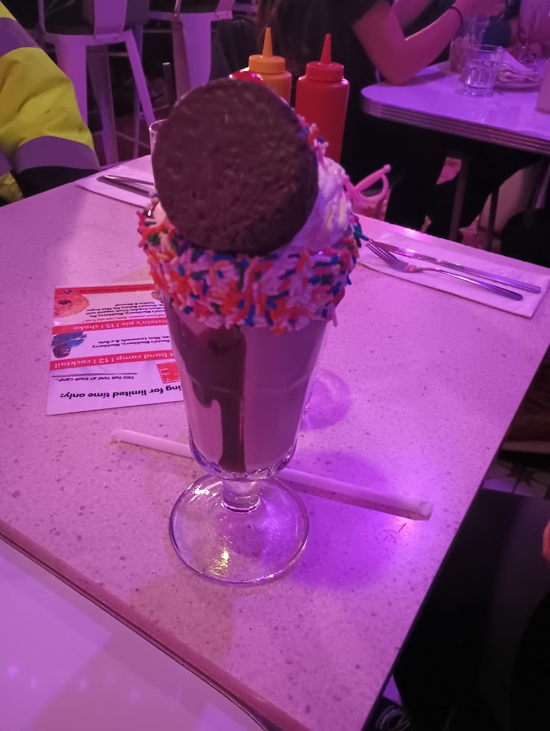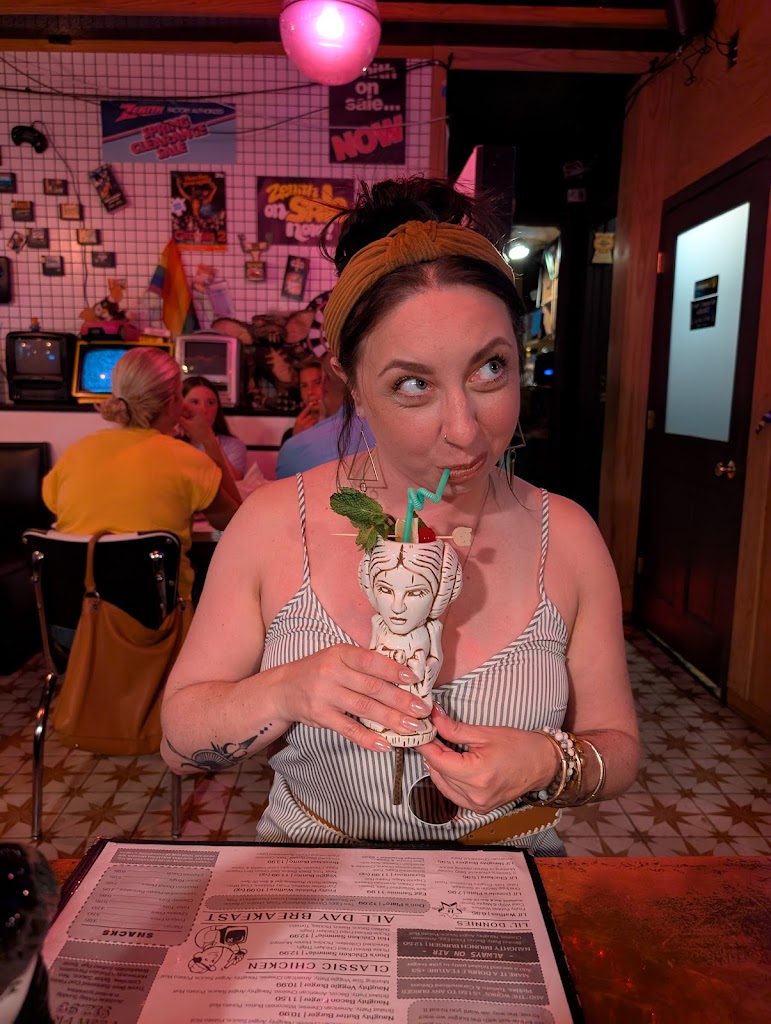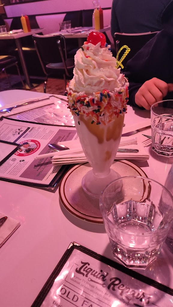 Fun atmosphere, fun experience. Kind of flubbed the process with no reservation, but they made a space for us on the fly. Really enjoyed the solid burgers, nerd theme cocktails and the super strong and tasty boozy shakes. The food is diner fair so be prepared for some oil, lol.