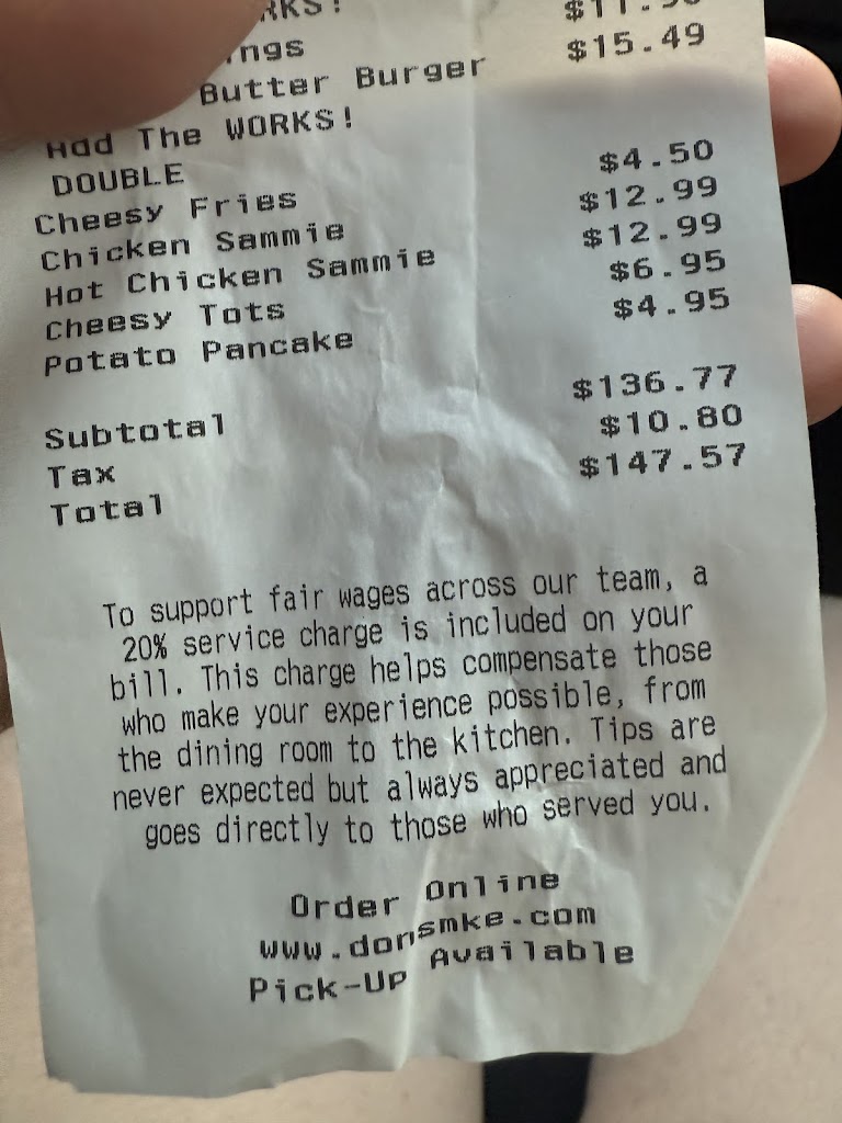 , 186 dollars later for 5 cheeseburgers, 3 milkshakes, and had to order a side of cheese fries, sodas, onion rings and cheese curds as they didn’t come with a 13 dollar burger! The waiter told us the 20 percent mandatory gratuity was for the hostess and kitchen staff and didn’t patronize him! Amazing burgers and food, but not 186 dollars plus tip! Go to Sullys! This restaurant pushed you out quickly to accommodate the waiting room even when you have a reservation and waited 20 minutes past your scheduled “appointment”