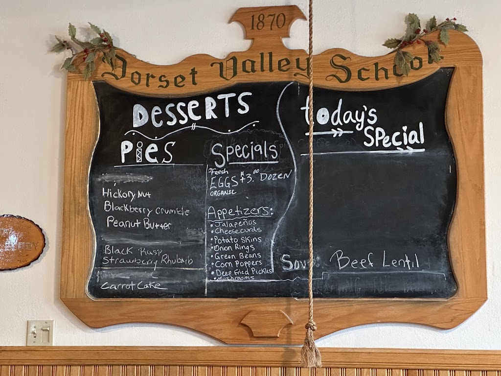 Had lunch here for the first time and I sure will be back. The deep fried breaded mushrooms were huge and breading was so to die for. Best breaded mushrooms ever!!! I also had the cheeseburger and fries which were excellent. Ended the meal with a slice of hickory nut pie, delicious also. My freind had the chef salad that covered the whole plate.,they don't skip on the ingredients like some resturants. Very pleasant waitress tended to all our questions and needs. Great atmosphere, friendly and accomadating., told the hubby guess where we are going for our next dinner out. I highly recommend that you take a drive out to the Dorset Valley Schoolhouse Restaurnt for a delicious meal.