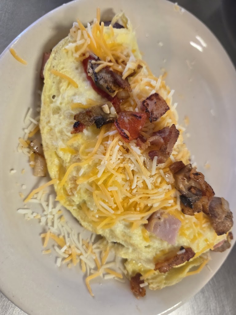 I had an omelette with sausage, mushrooms, and onions, cheddar inside and on top. Should have ordered another one to go!