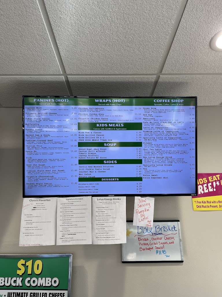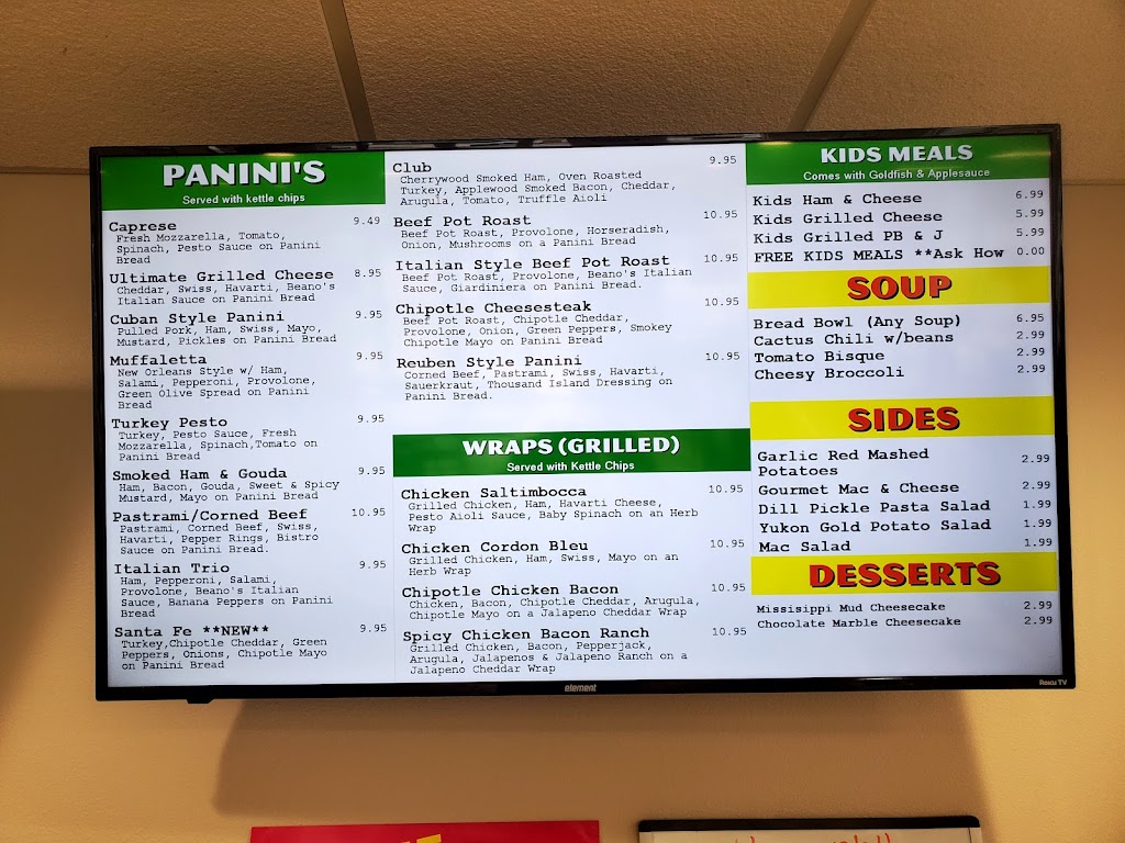 Prices were high. Panini were just okay. I liked the chips. And dill salad. The chili was overflowing and not in a good sense. They have one panini press for all sandwiches. We waited extremely long. Panini presses are inexpensive. Invest in your operation before you lose it. Place was clean. Also, you advertise subs on your display case but not the menu. Some clarification would be excellent. Not on here, on your menu. All in an all, probably not going to stop again. It'll do for one trip. So take the high points and lows for what them are. Just suggested improvement.