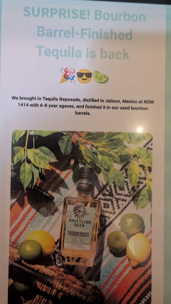 The restaurant is fantastic. We've yet to have a dish we haven't enjoyed. We try to make it a point to stop in when we're traveling through the area. The spirits are also great. I'm a rye fan, and the 10-year rye is *chefs kiss* delicious. If you like good food or good drinks, Driftless Glenn is definitely worth a stop.