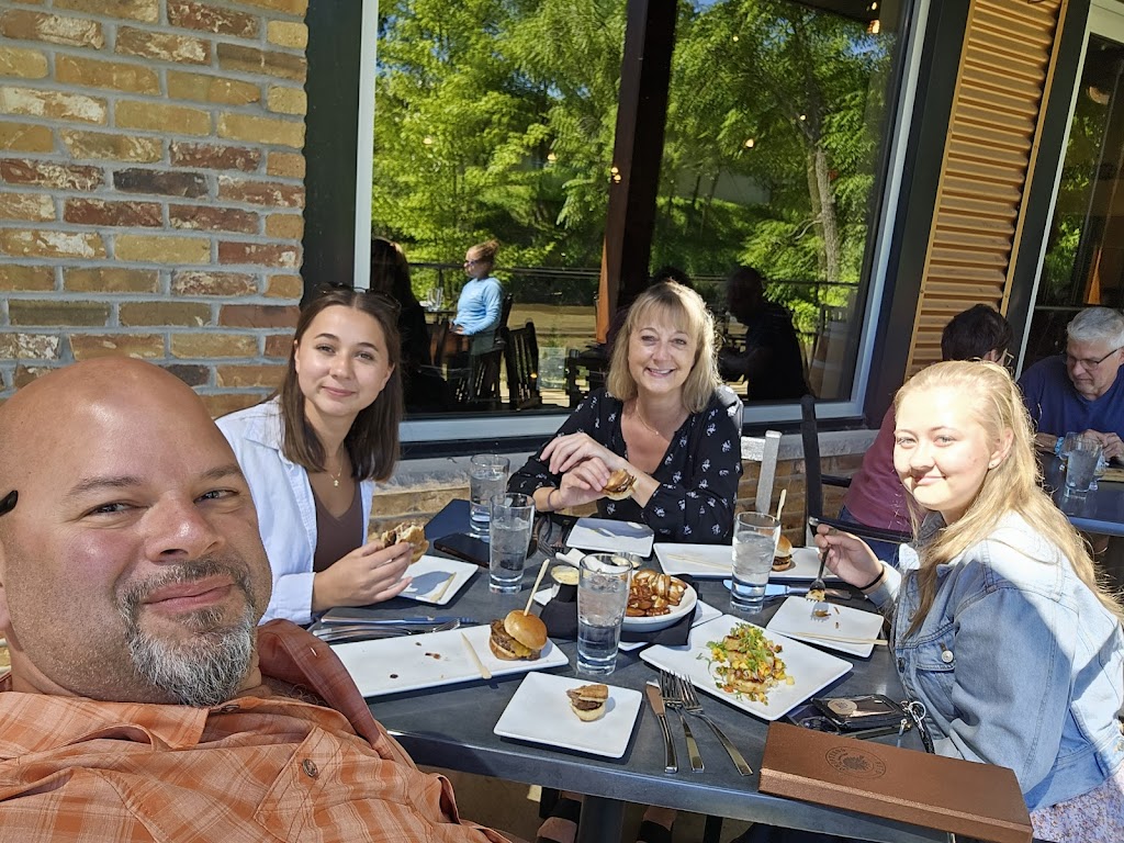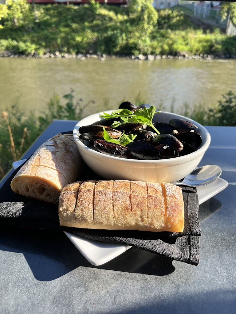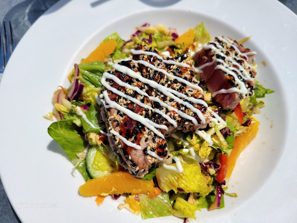 Came here after hiking at Devil's Lake on a beautiful fall afternoon. My husband and I have been here previously to do the bourbon tasting and tour which was great. Today we enjoyed a late lunch on the beautiful patio with views of the Baraboo River. We were with my husband's siblings and spouses and all enjoyed our meals. Two in our family are very picky eaters and loved their food. We enjoyed the gin steamed mussels, miso pork belly tacos, jumbo lump crab cakes, ginger soy tuna salad, ribeye crostini and the heirloom tomato steak salad. We were too early to be able to order from the dinner menu but found plenty of options as you can see that were all delicious. Plus the bourbon flights were very reasonably priced. We will definitely be back the next time we are in this area. I only remembered to take a picture of two of our meals unfortunately, they were all plated beautifully.