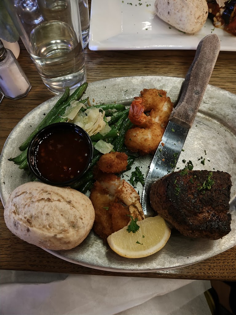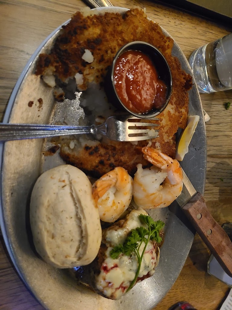 This place is clearly a favorite among its patrons. The place was packed and noisy, and I’m glad I had made reservations. I ordered medium rare filet mignon and sautéed shrimp with hash browns on the side. The hash browns were outstanding. The steak was tough and dry. The shrimp was plump but bland and cold. Pretty disappointing for a $50 meal.