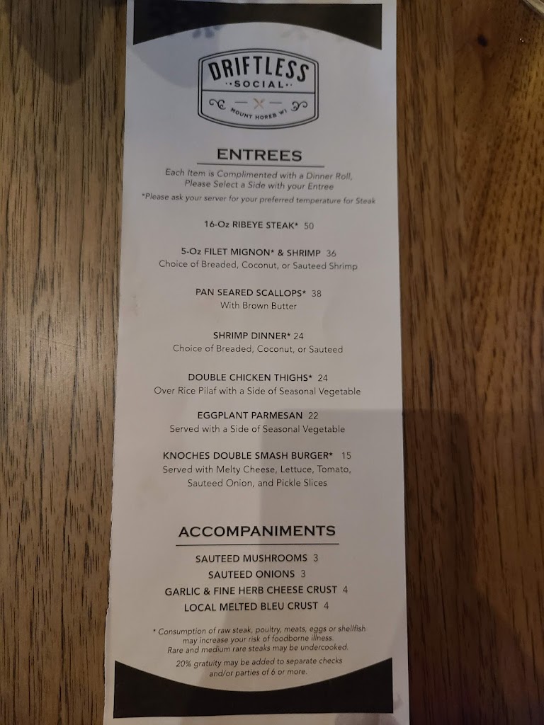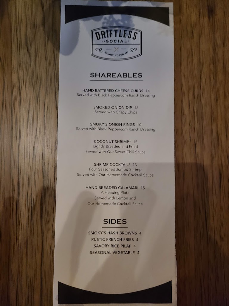We had an amazing dinner at driftless! The food was delicious, the drinks were enjoyable, and the staff was friendly and amazing. The quality of food they use is top notch. Our two year old enjoyed the smoked onion dip to use with his French fries. He highly recommends that’s as an appetizer. We will be back again for a wonderful dinner.