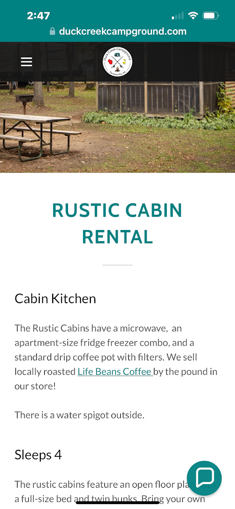 My husband and I really enjoy coming to Duck Creek. It is small and cozy, yet has all the amenities one could need. Really appreciate the tall, mature trees and the swim pond. Good food at the restaurant too.