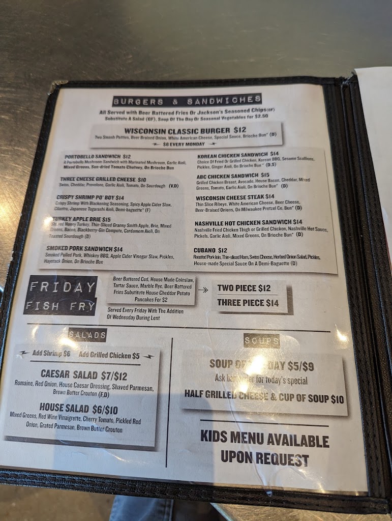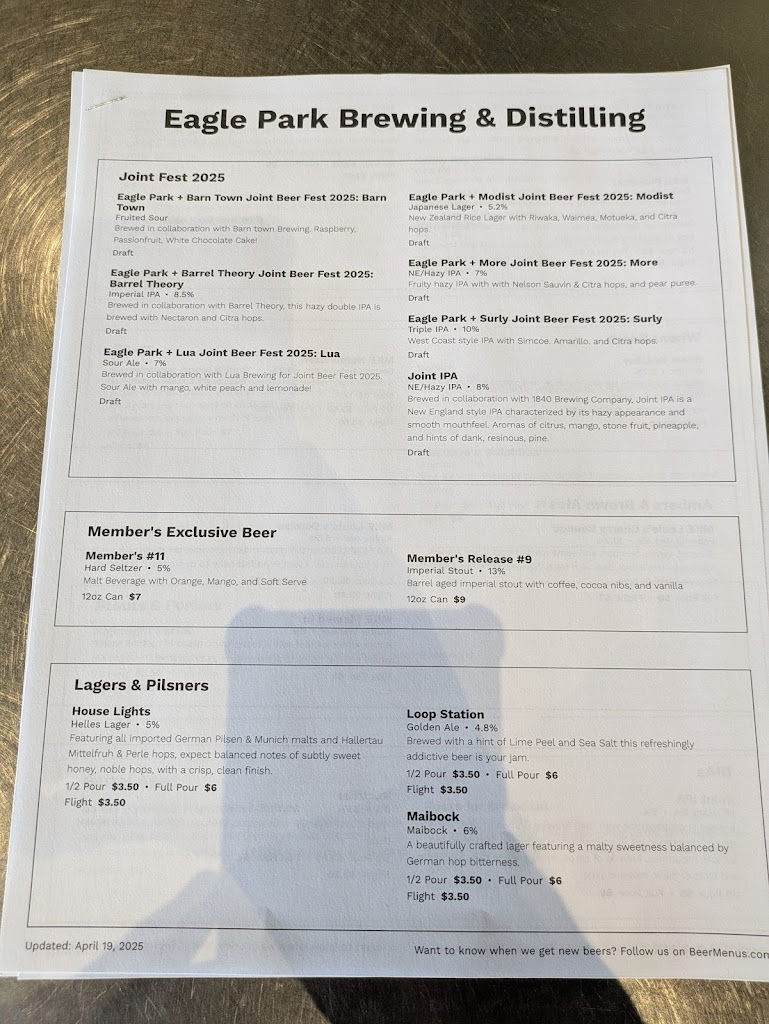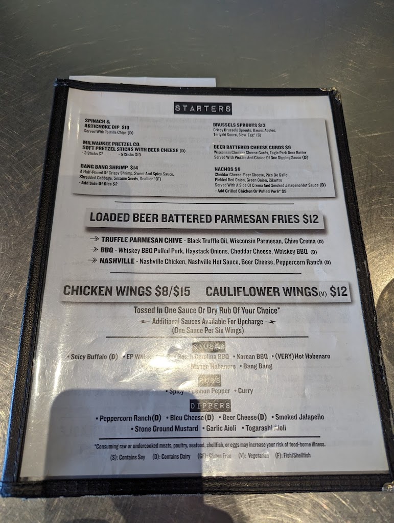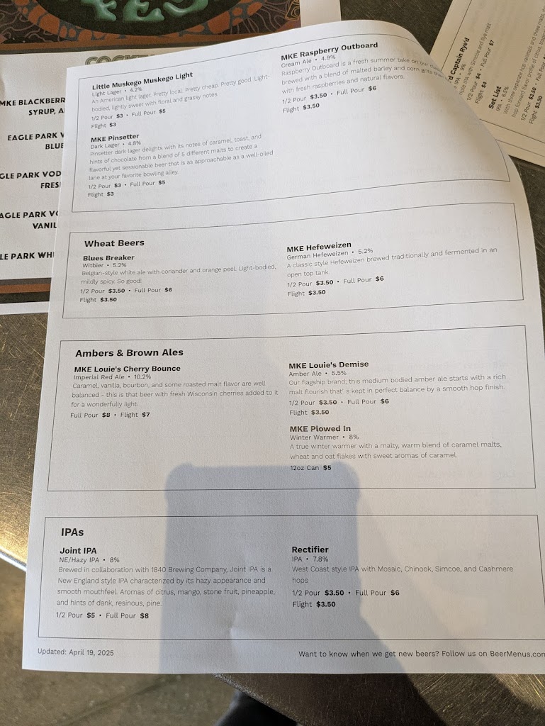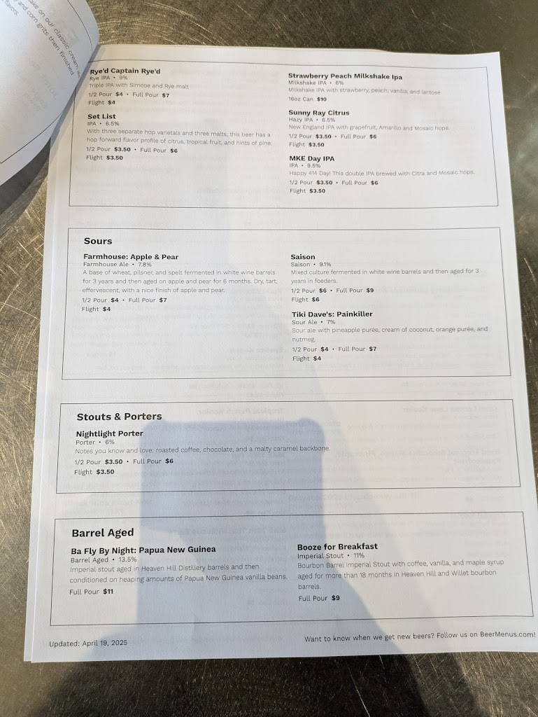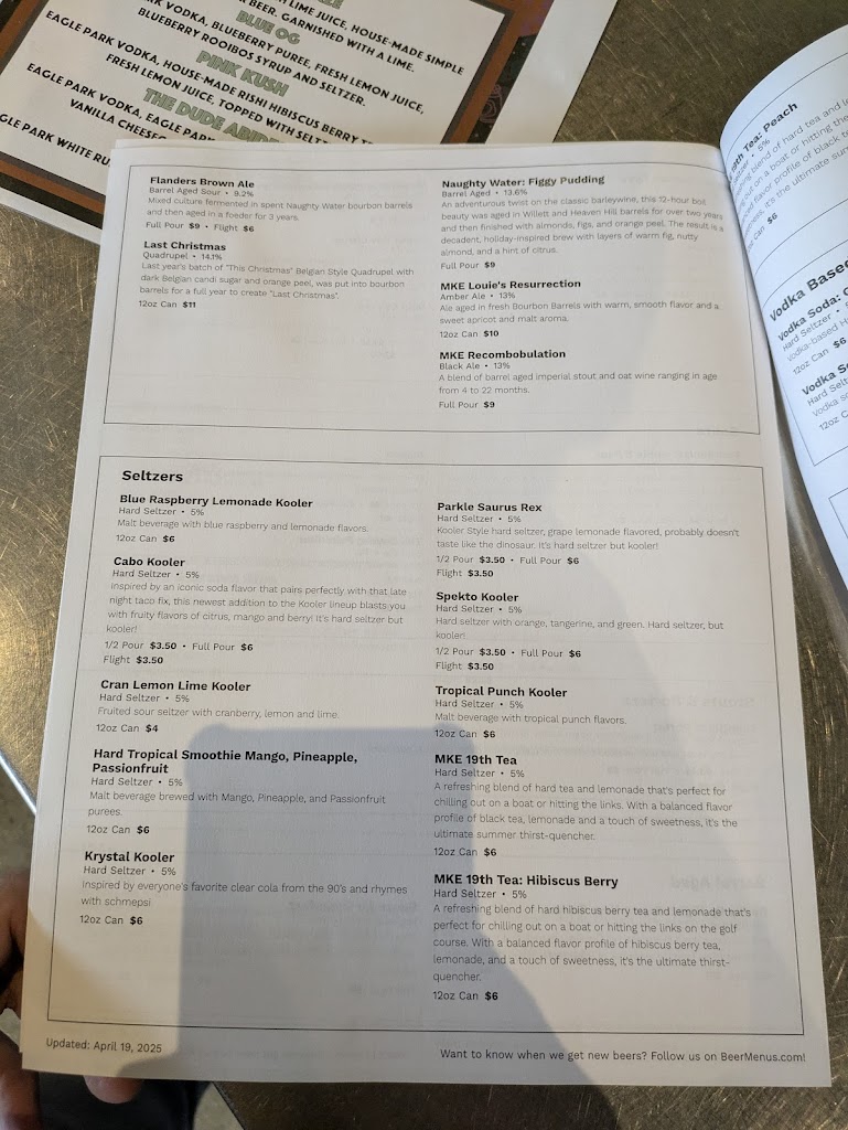 This establishment is the total package. Great beer, great food, awesome staff, great service! I don’t recommend any brewery in the MKE area above Eagle Park.