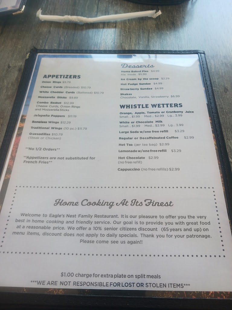 WE LOVE THE EAGLES NEST!!! It's our go to place. It's super clean. Great menu and portions are HUGE. Prices are reasonable. Most of all, we go there for the staff. Everyone is always very friendly and attentive. I love that the staff and owners know many patrons by name and they chat with them about their lives. So many times we've watched the staff run to get the door for older patrons. It's such a nice honey, welcoming place to go. Our favorite by far.