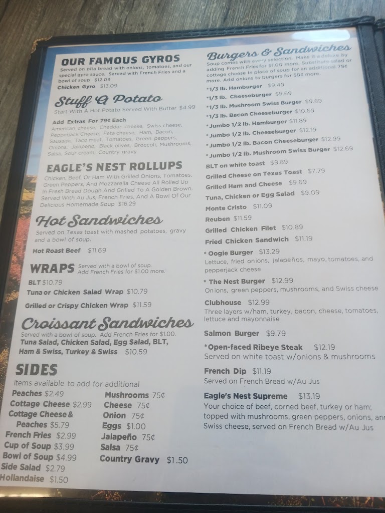 We like trying new small diners when out of town. Eagles nest was nothing short of amazing. Food was so spot on and filling, service was #1. I which I had the Eagles nest closer to home.