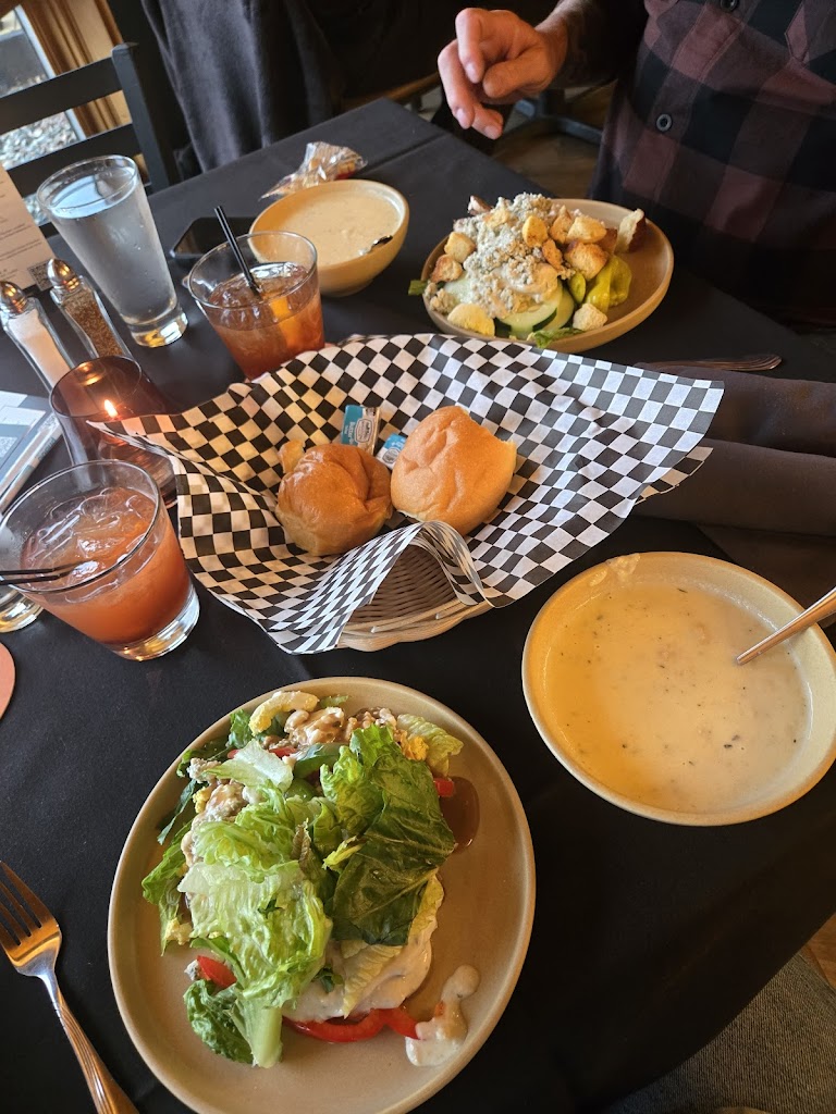 Overall vastly overpriced for what you get. Fries overdone, cod cooked well. Spaghetti sauce had too much tomato paste and not enough flavor for $18. View was nice enough. Menus were also mislabeled, charged extra for the salad bar even though it's specifically called out on the menu. Salad bar was fairly standard. Place was very clean.