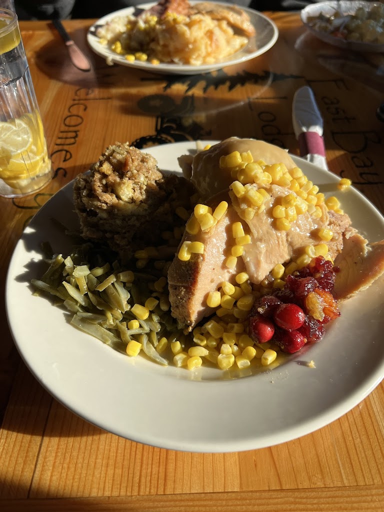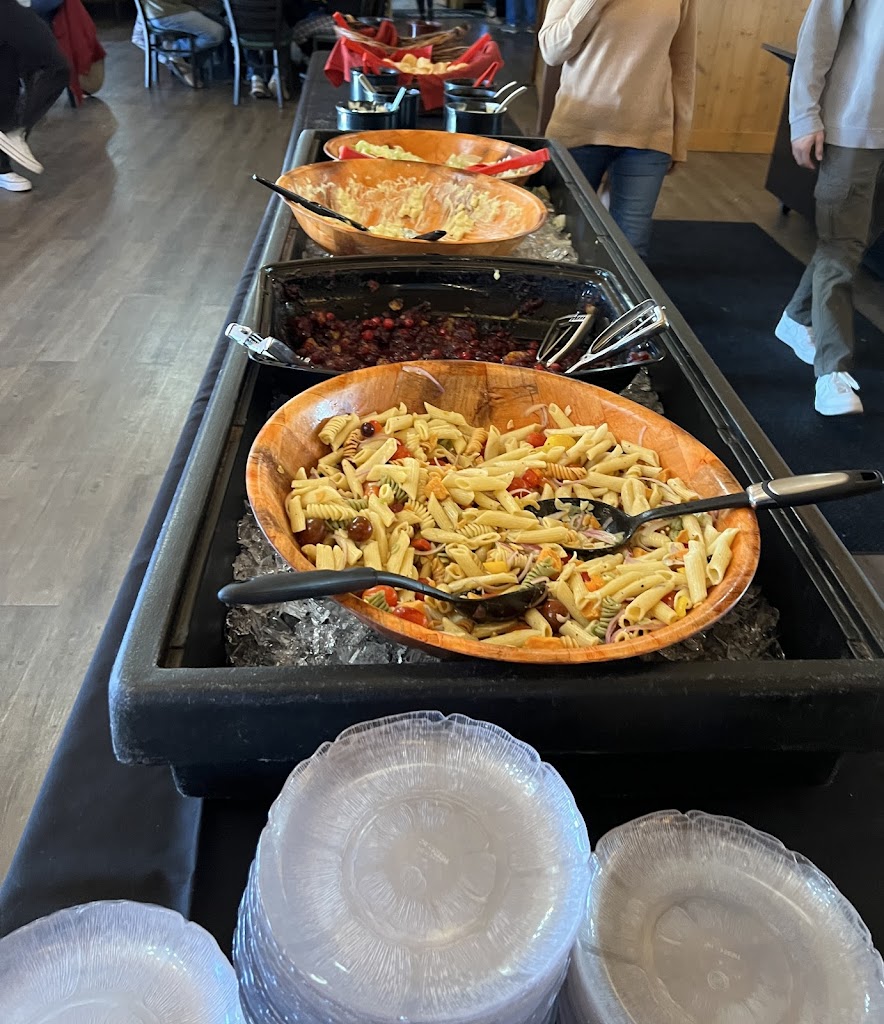 The food was delicious and served buffet style. Beef medallions in mushroom gravy, chicken, tossed salad, cheesy Potatoes, seed potatoes, corn and a variety of desserts.