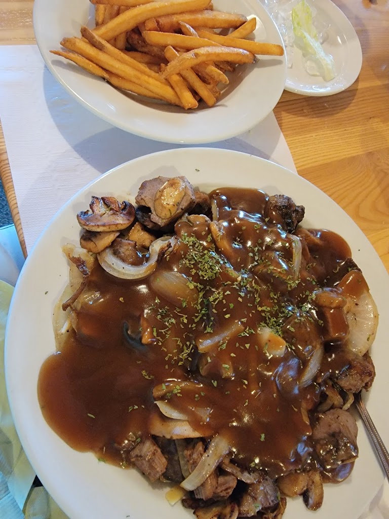 My husband & I dined here on a Tuesday. The service was fast & efficient. The staff all worked together to insure that all tables received great service. I had the crab cake special. This was served with a mustard sauce. The sauce had a little zip, which made it perfect. Very good! My husband had jagerschnitzel. He said that he would definitely order it again. The view from the dining room overlooks majestic pine trees and the Eagle River.