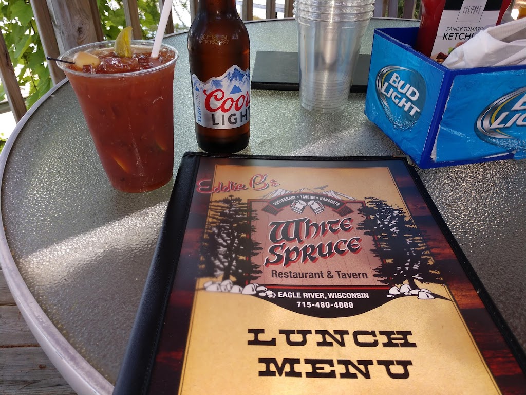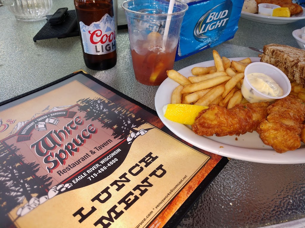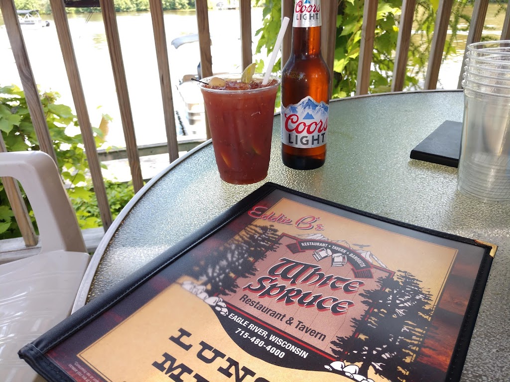 1st visit to Eddie B's White Spruce Inn in Eagle River on Yellow Birch. Dined on the deck overlooking the water, pleasant Northern Wisconsin day. Jan was our server, she was excellent. Tried the Fish Fry, 3 piece cod, lightly breaded - I had the fries, she had the mashed. Everything was delicious, we'll definitely be back.