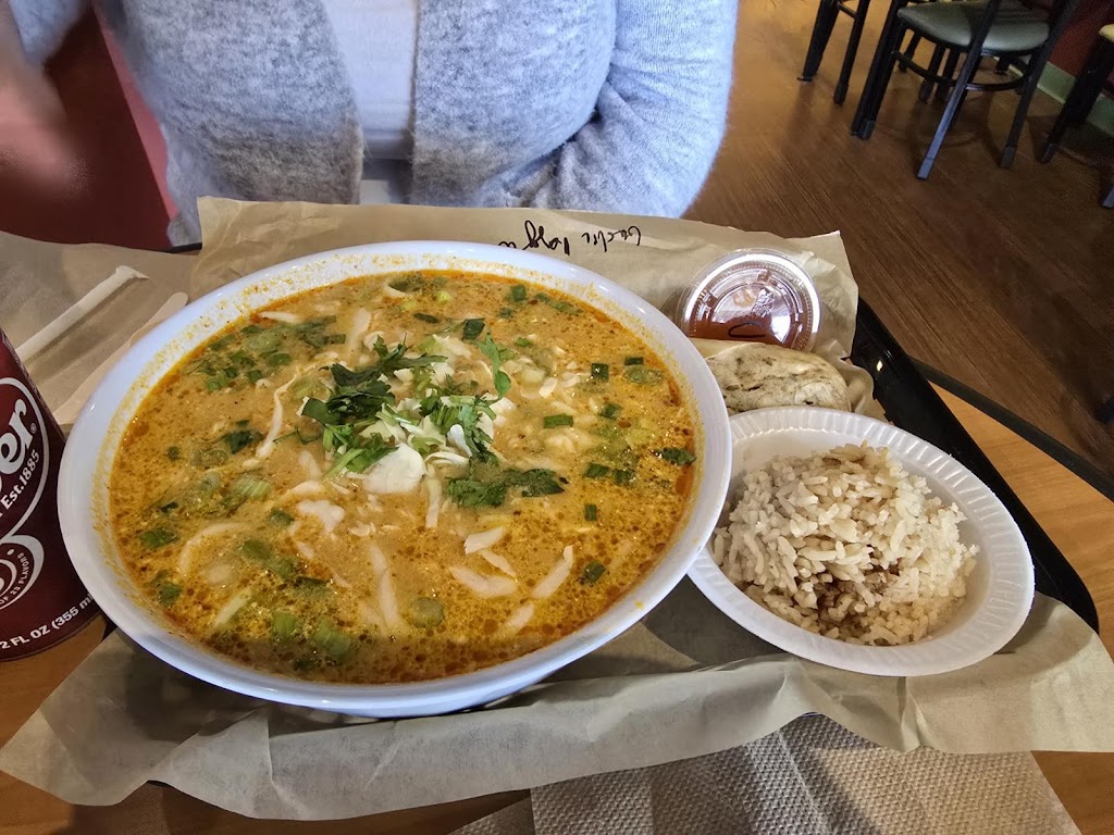 Prob best $12.50 meal ever had. Curry soup with jerk chkn egg roll combo + drink.