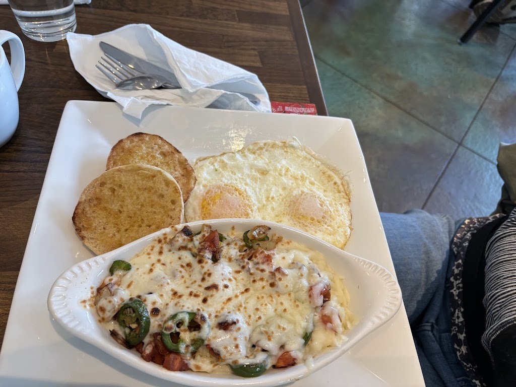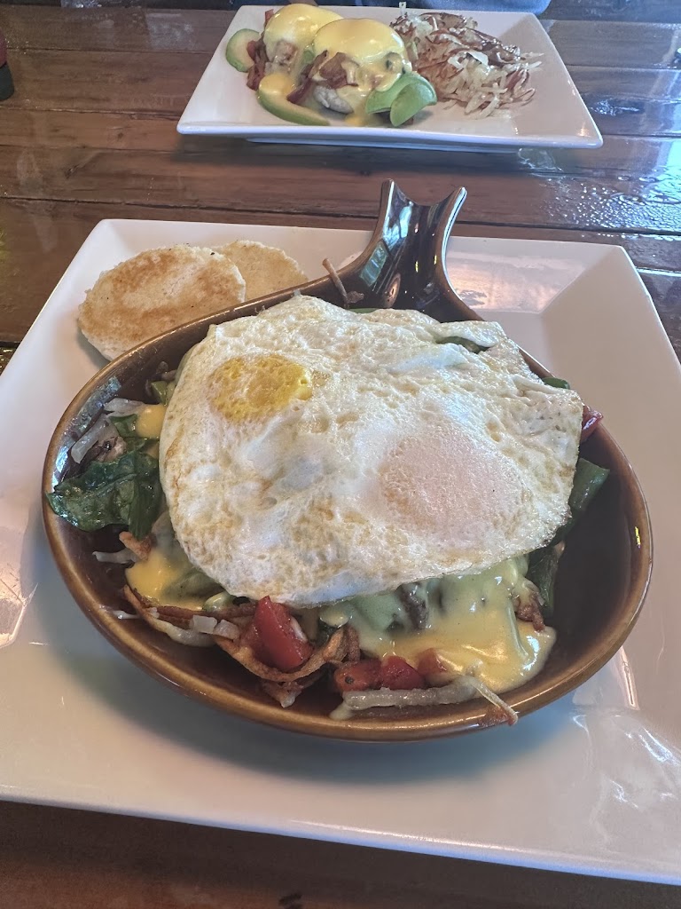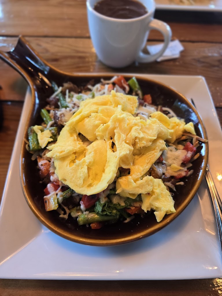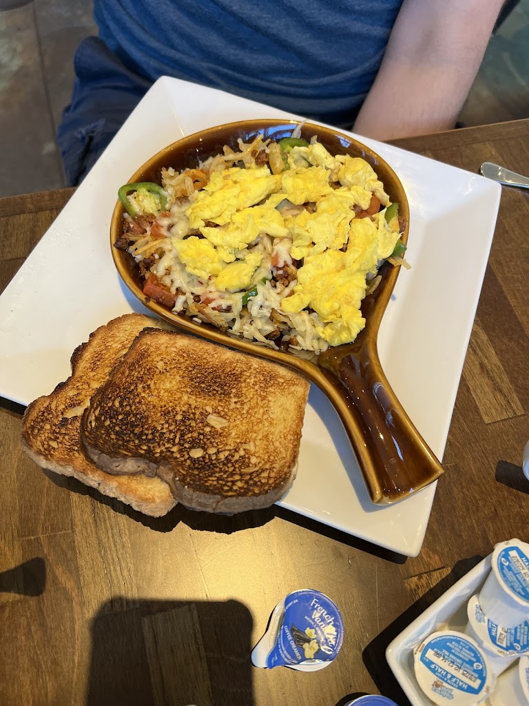 Food: Mexican skillet and steak and egg skillet (avocado added to both). Ebglish muffin and small pancake. Mexican skillet was fantastic. Even with the jalapeños it was just the right heat for me. 5 stars. Steak and egg skillet was very good. 4.5 stars. Pancake was your standard pancake. 4 stars. I really like the english muffin well toasted and buttered. 4 stars.