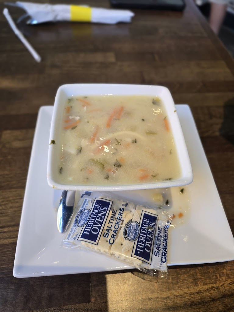 Stopped here for lunch with my friend Tony, we both had the chicken Florentine wrap and a cup of soup, He had the chicken noodle, I had the cream of potato, both soups and wraps were delicious. The waitstaff is very friendly and attentive. Atmosphere was lovely. Really liked the wood work.