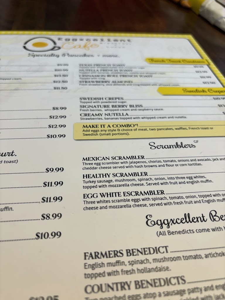 Delicious food, kind people, and an open, bright atmosphere. Each time I've been to Eggxcellent, I'm thrilled with my meal and the hardworking staff who really wants customers to be comfortable and happy with their experience.