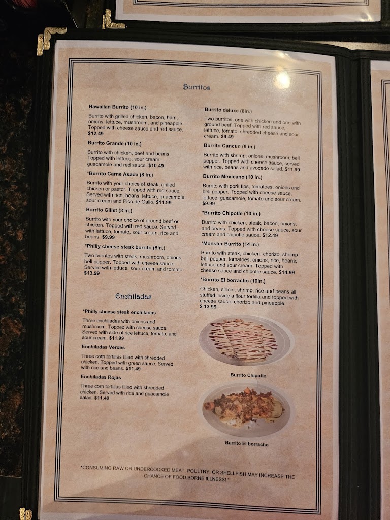 We will definitely be visiting again. The portions were extremely generous and the prices were very reasonable. The philly cheesesteak burrito was super flavorful. The monster burrito had more food than I could eat in one sitting. The steak Texano offered an amazing amount of food as well and had a great flavor. Everything came to the table in a timely manner and even as a table of six we were all eating at the same time.