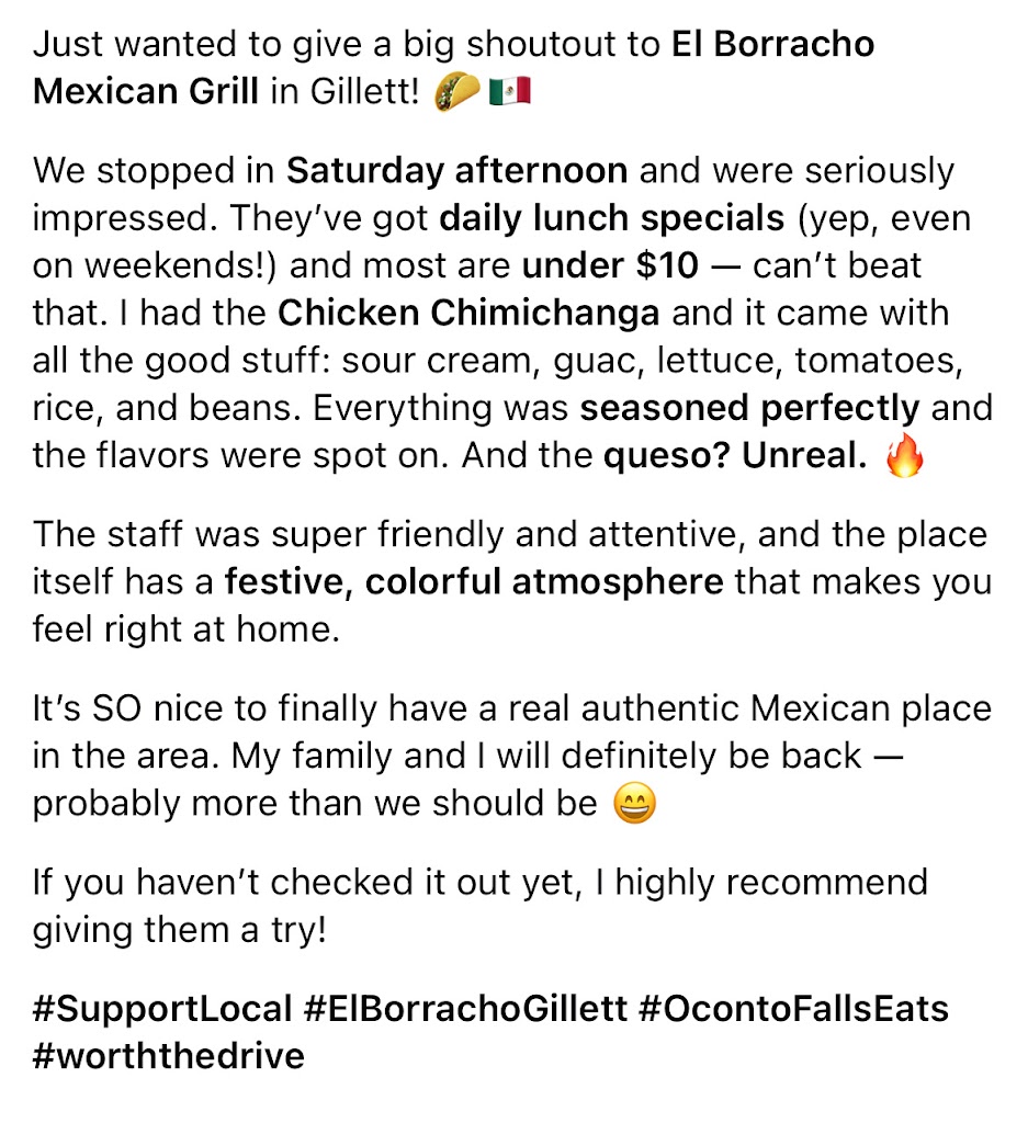 I can't wait to see this restaurant thrive. It's a wonderful addition to the Gillett area.
