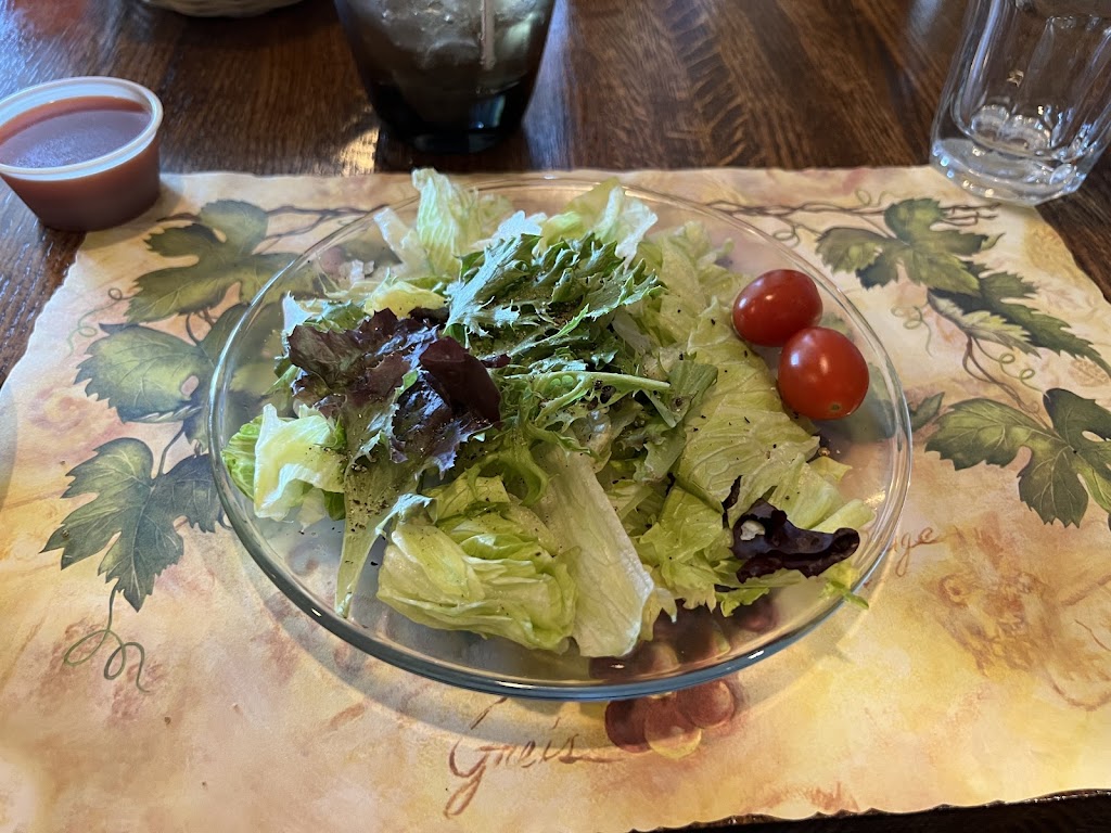 The salad consisted of limp lettuce and two soggy tomatoes, dressing, and nothing else.