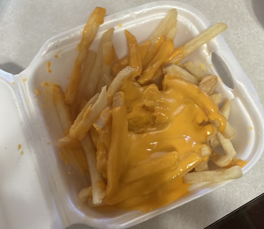 My hubby's go to is double cheeseburger with cheese fries and I get the gyro salad with spicy potato wedges or grilled cheese with bacon.