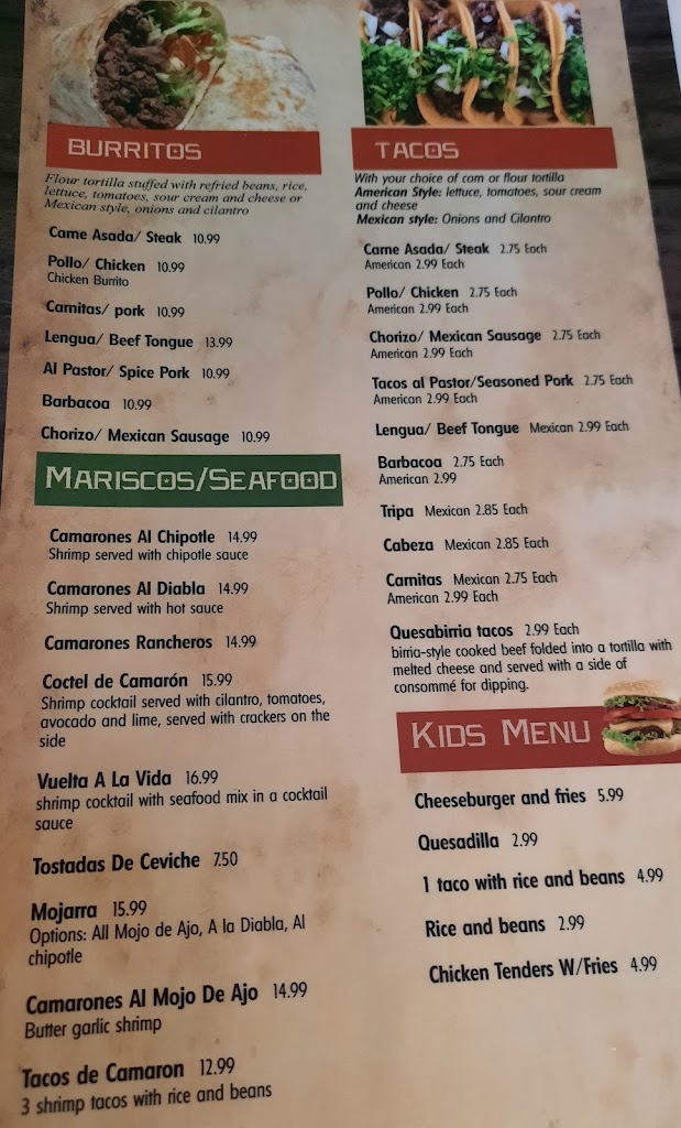 Carne asada tacos and burritos were very good. Service was a little on the slow side but we will be back.