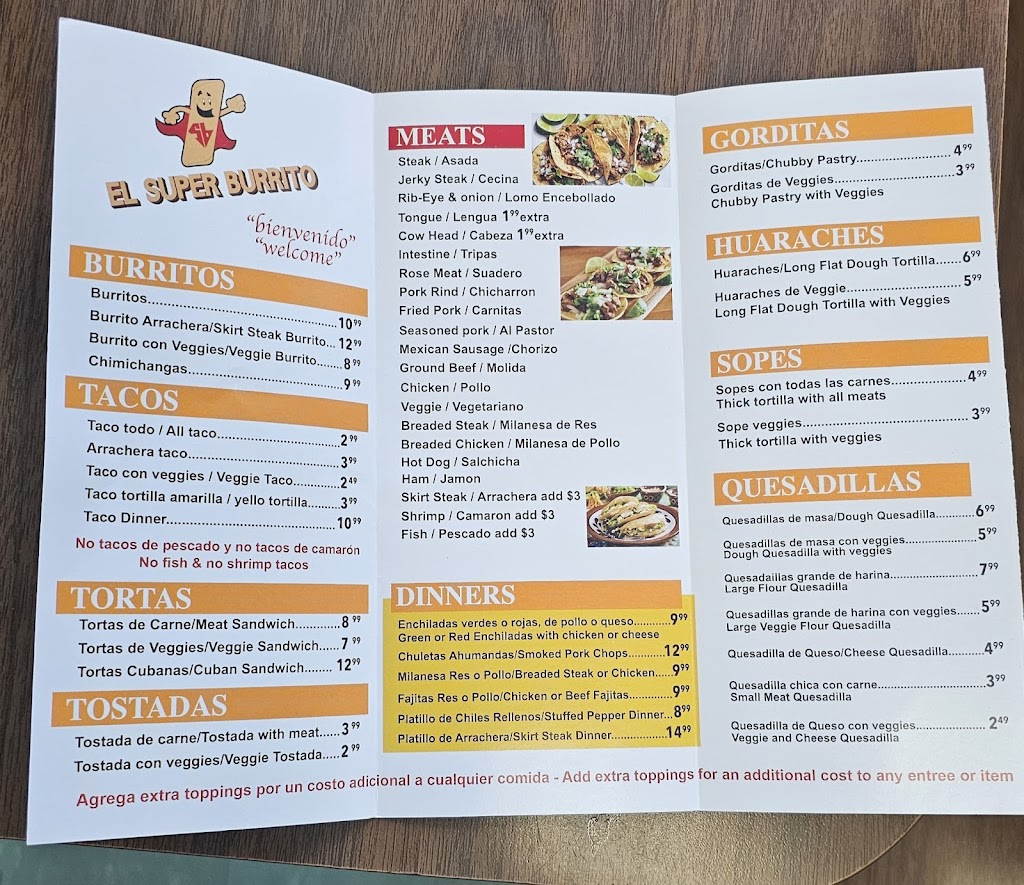 Great burritos. First time visit last night. I ordered FOUR to go. They were ready quick & were fantastic. Great food & a good little supermarcado too.