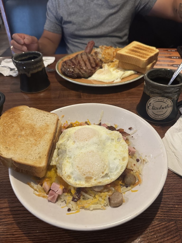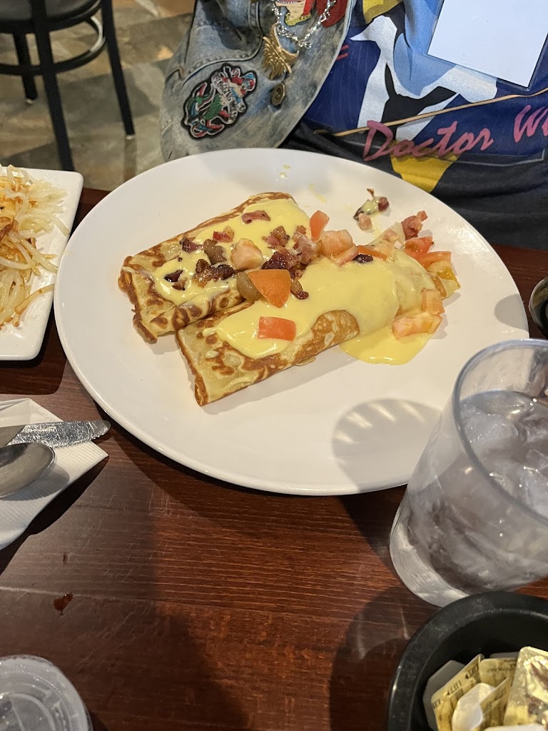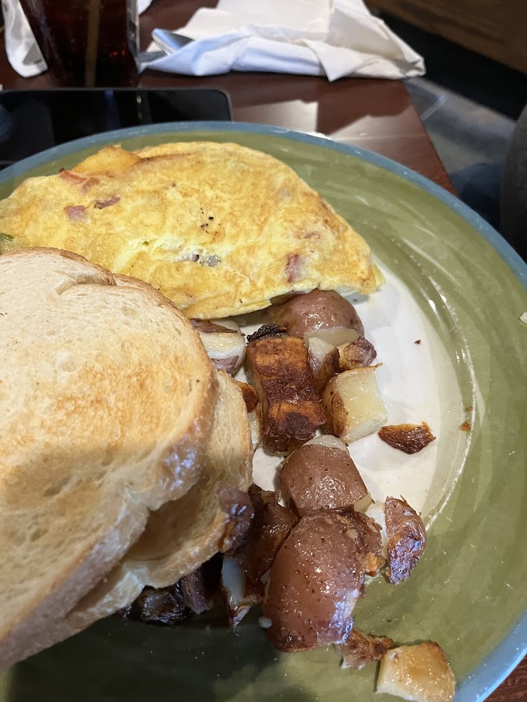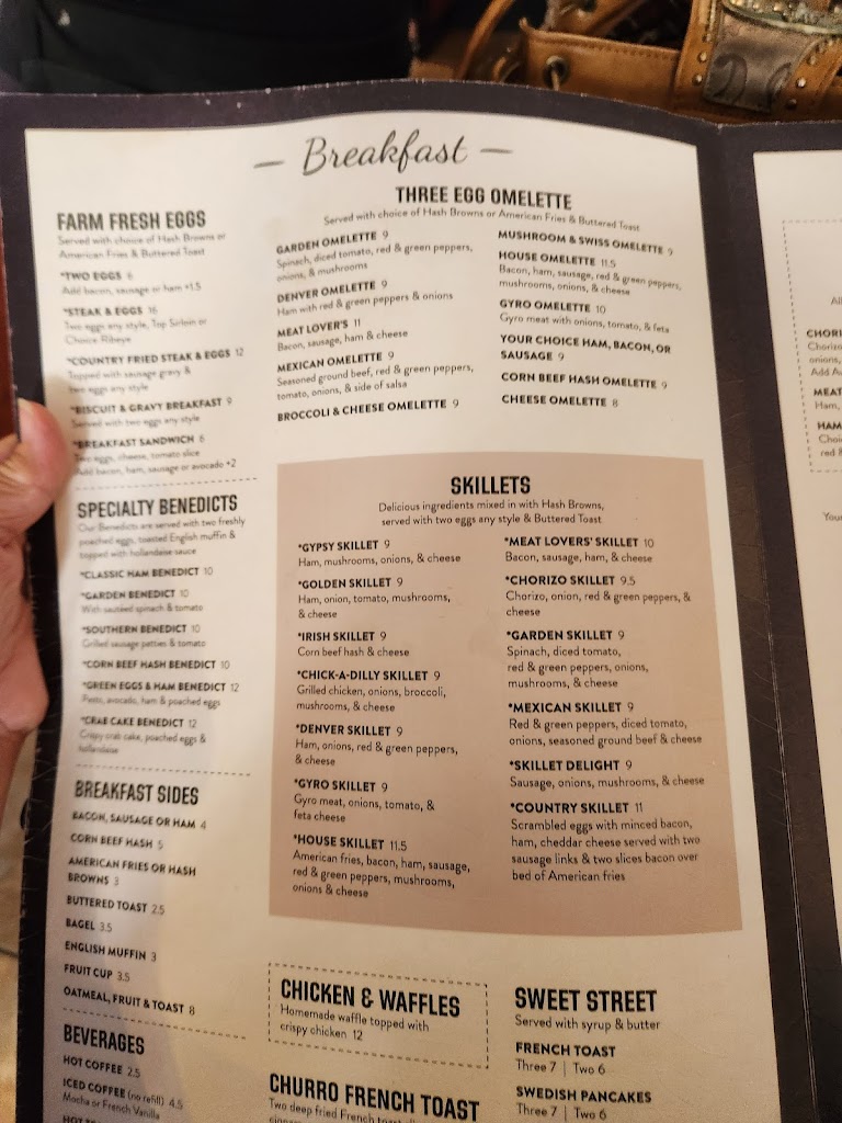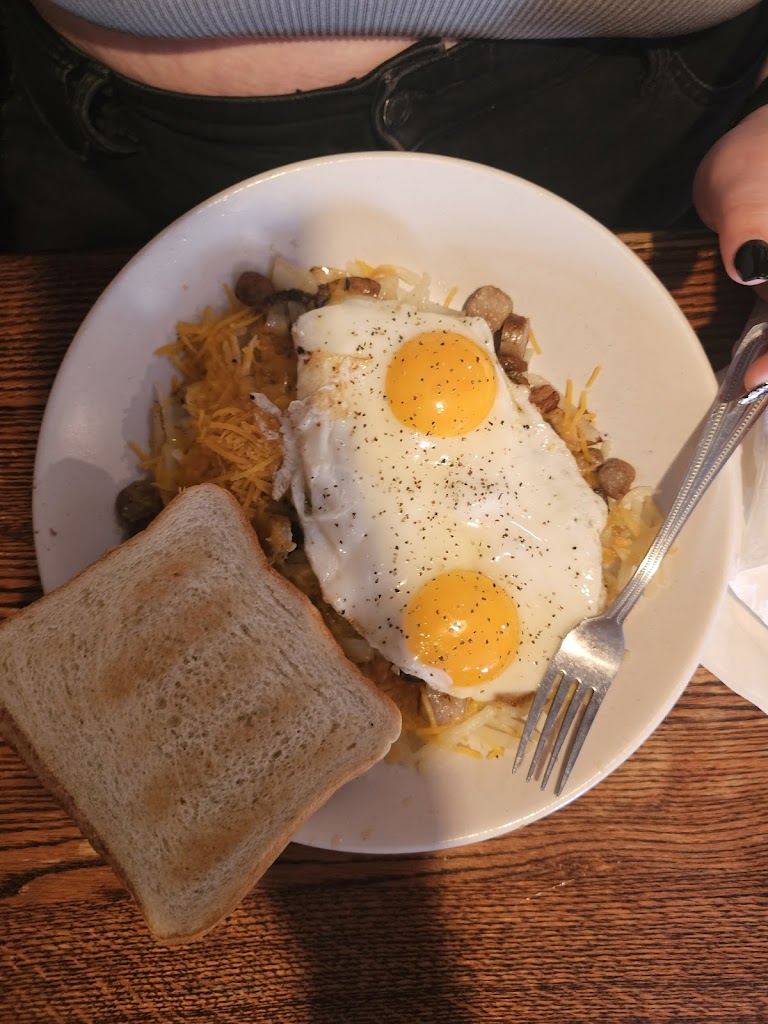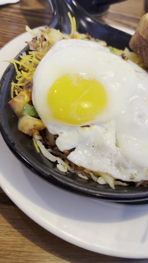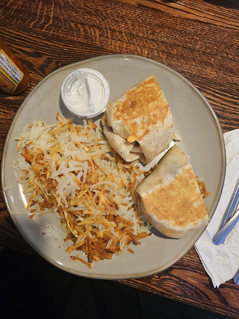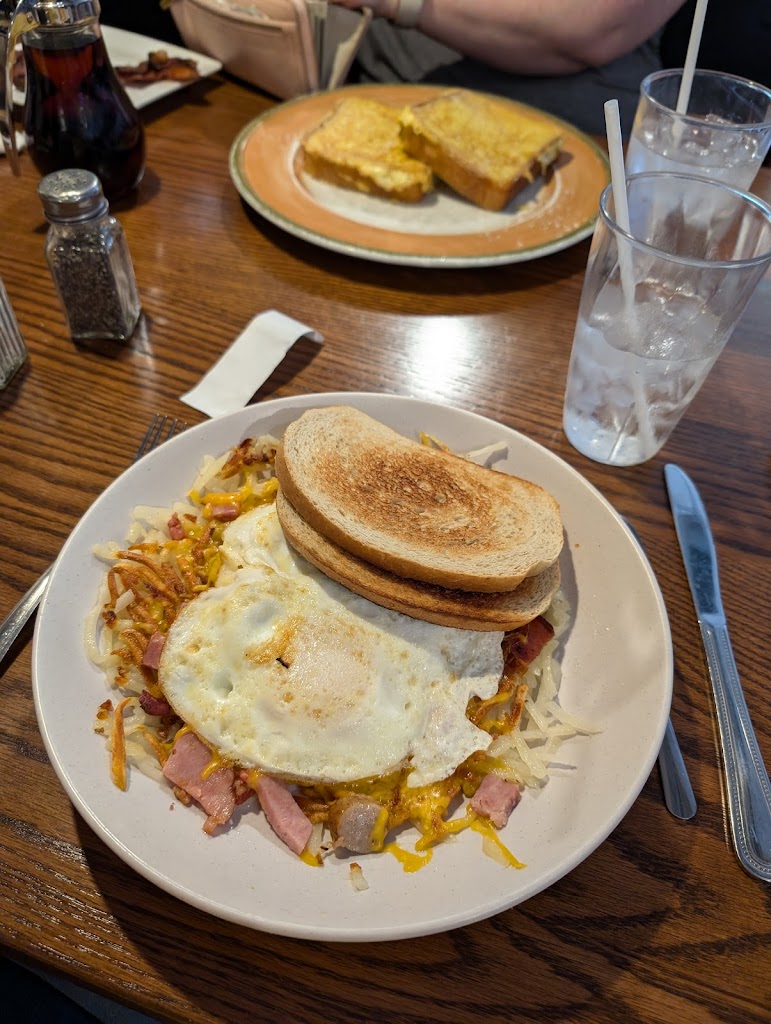 This is my second time eating here. The first time was way better imo. The food this time was lacking due to it being so busy. My gyro burrito was good but the hash browns were pretty sad. Im not sure they were cooked all the way and they were excessively greesy. My cucumber sauce was messy on the outside of the container. My wife had a skillet delight and she said it was okay. However, there was a piece of chicken in it, even though there was not chicken listed in the dish on the menu and it was only one piece so like how did that even get in there. Service was really bumping. The host was polite and we had to wait for our table but not very long.