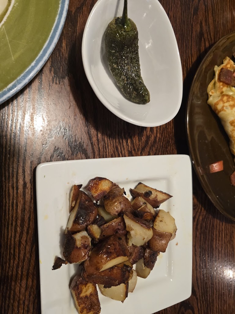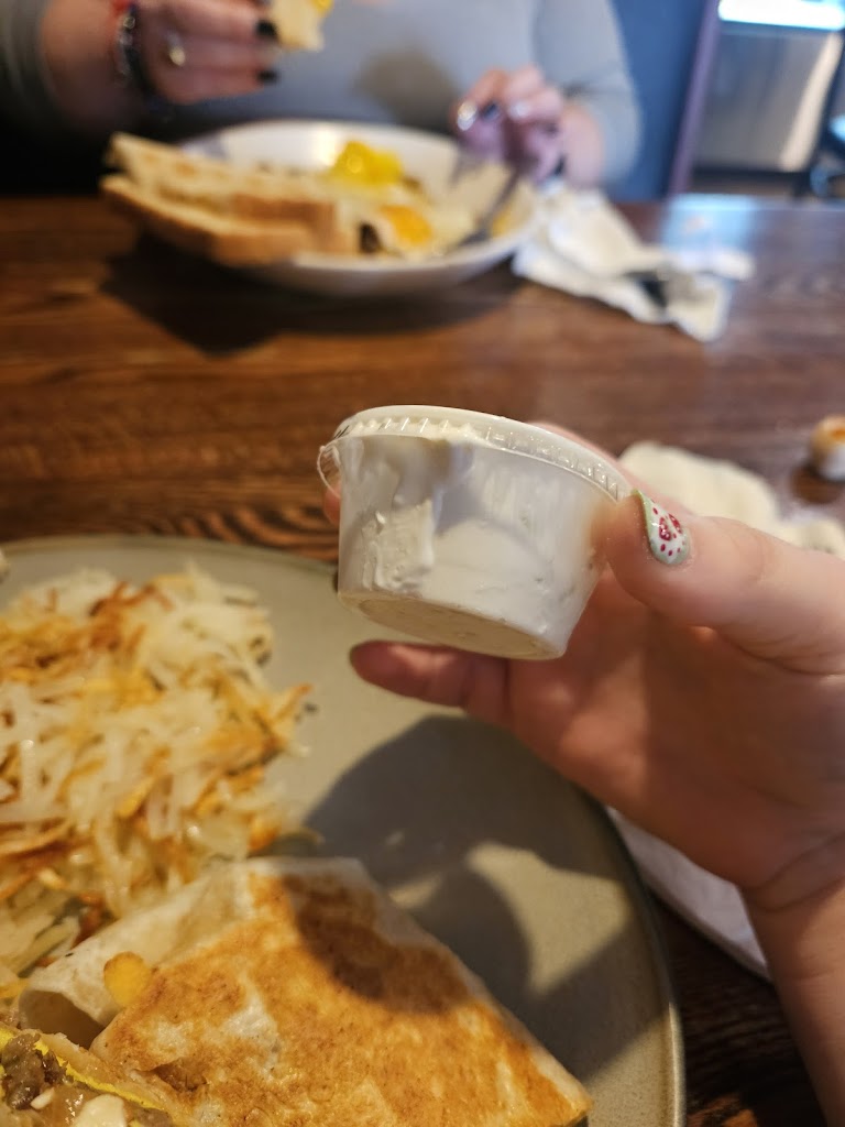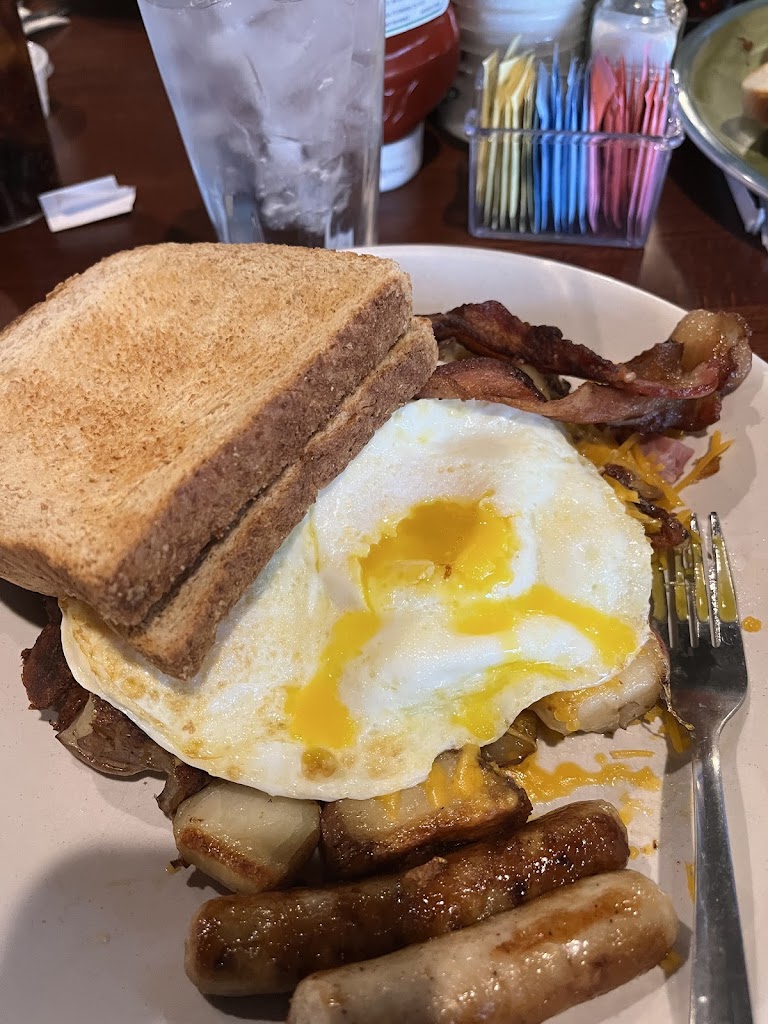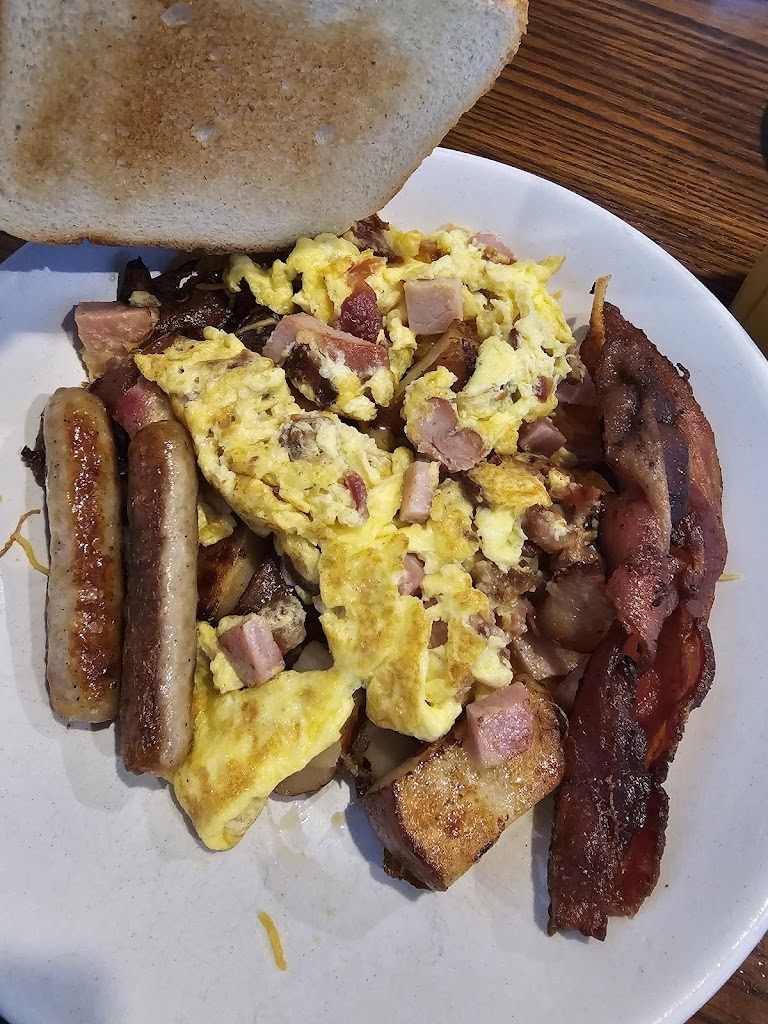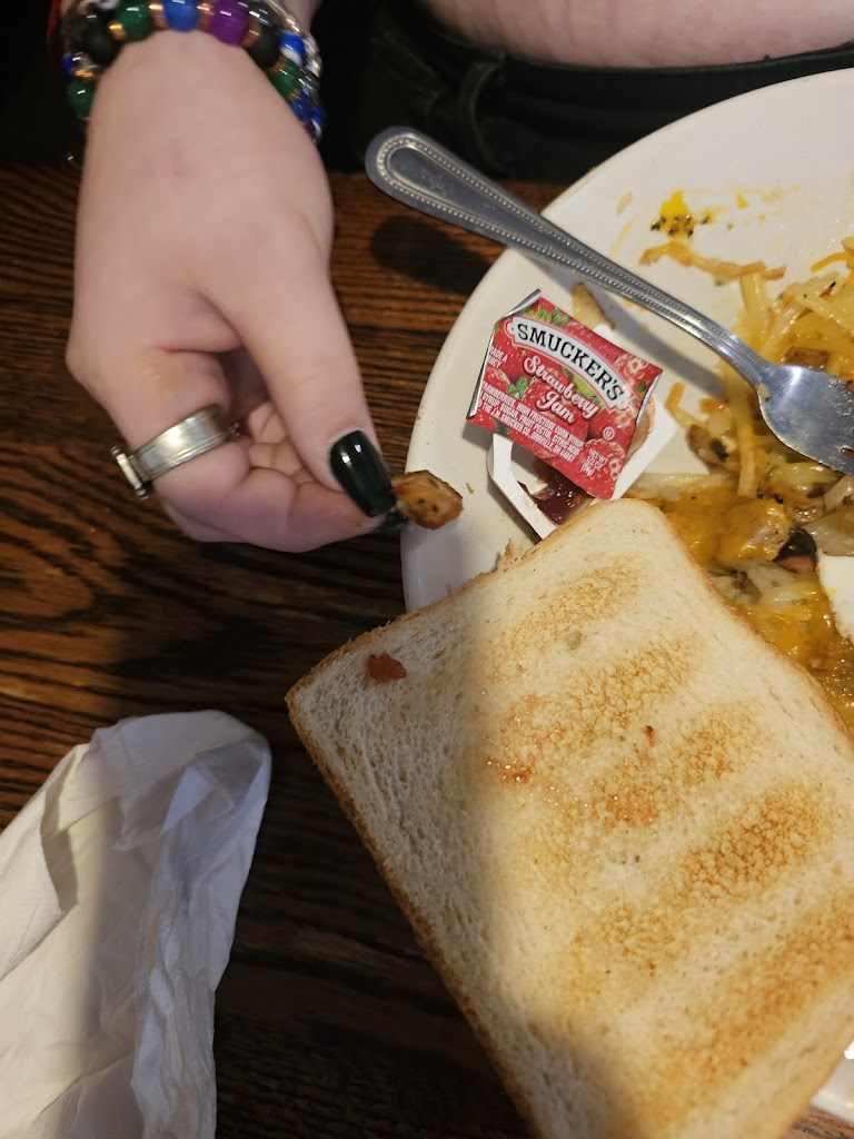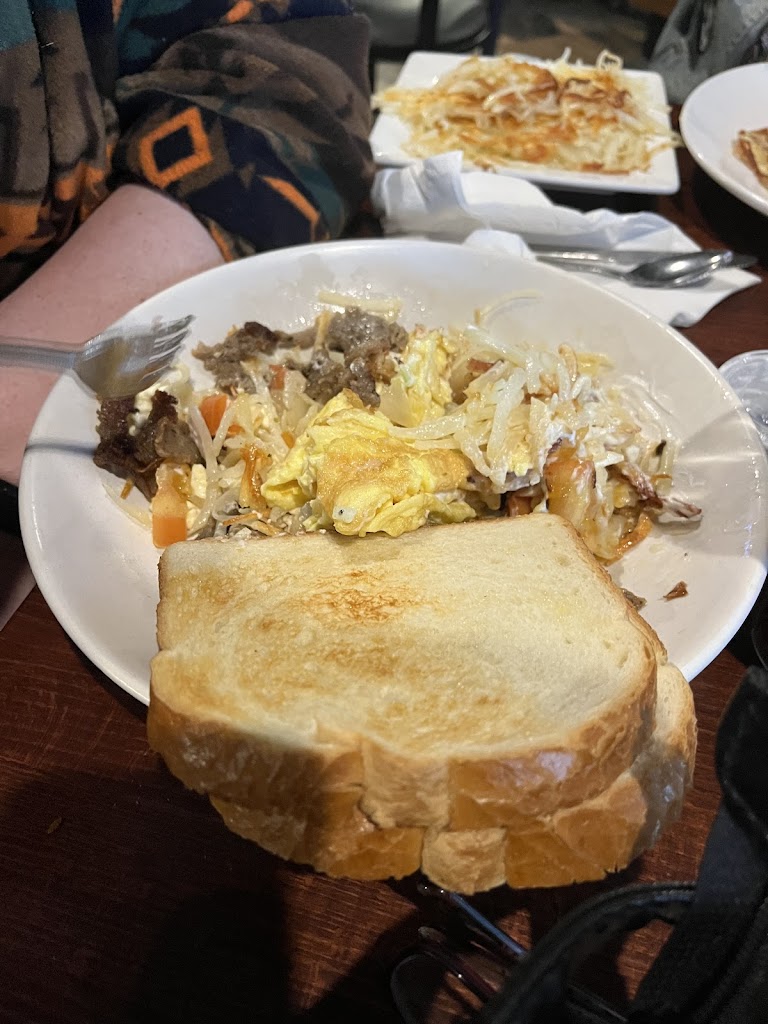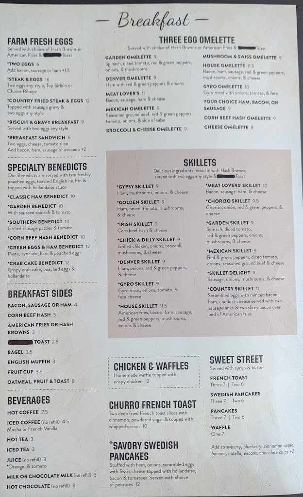 This is my second time eating here. The first time was way better imo. The food this time was lacking due to it being so busy. My gyro burrito was good but the hash browns were pretty sad. Im not sure they were cooked all the way and they were excessively greesy. My cucumber sauce was messy on the outside of the container. My wife had a skillet delight and she said it was okay. However, there was a piece of chicken in it, even though there was not chicken listed in the dish on the menu and it was only one piece so like how did that even get in there. Service was really bumping. The host was polite and we had to wait for our table but not very long.