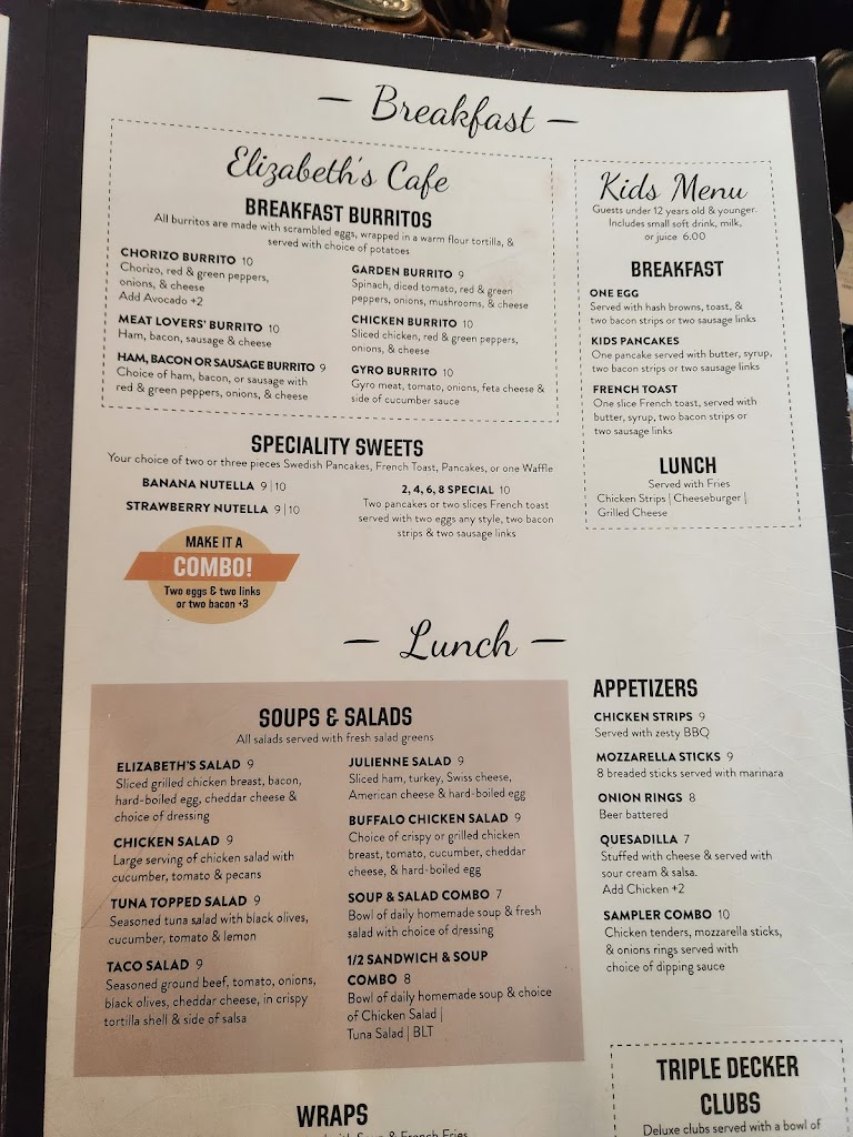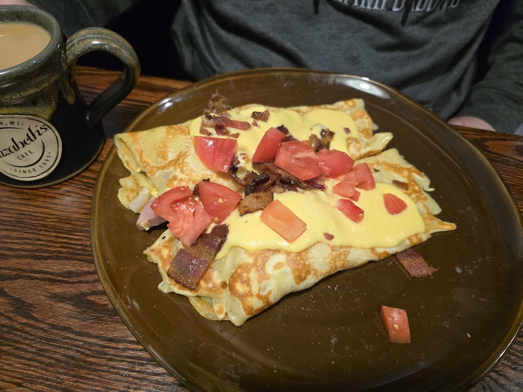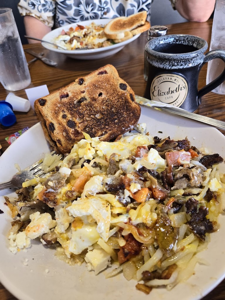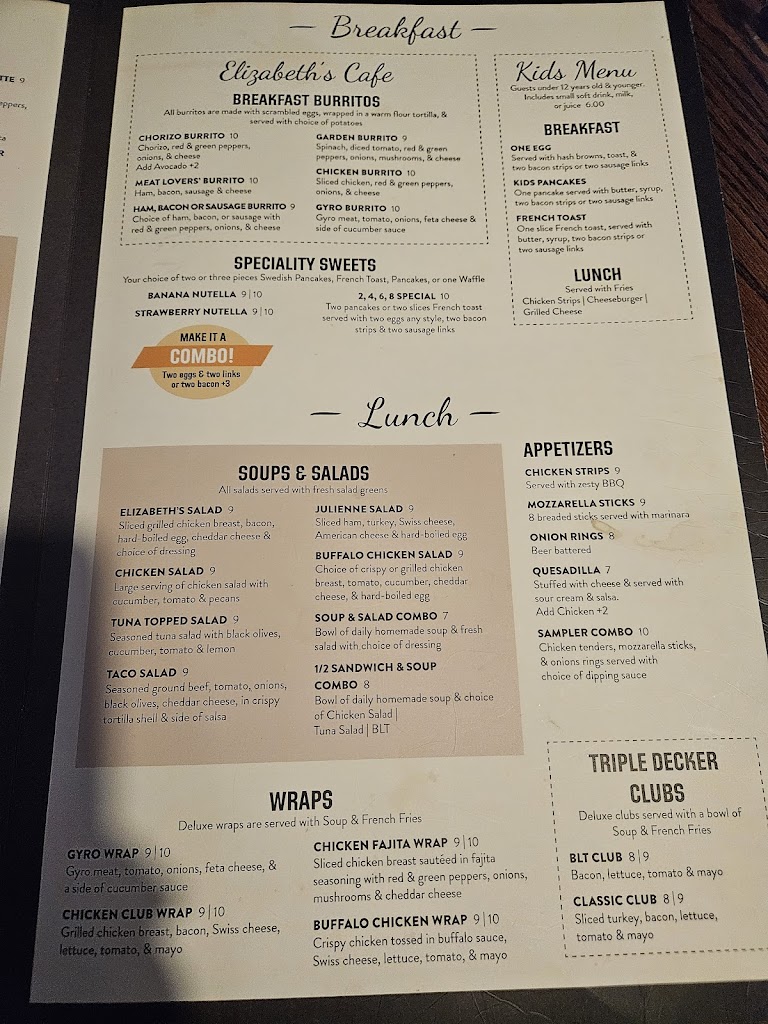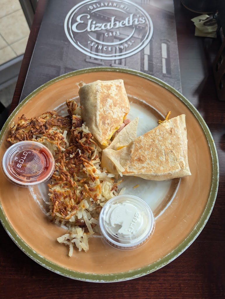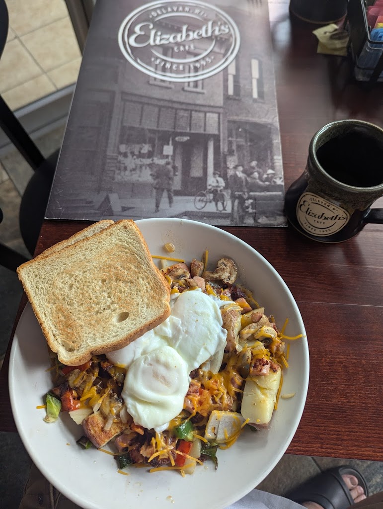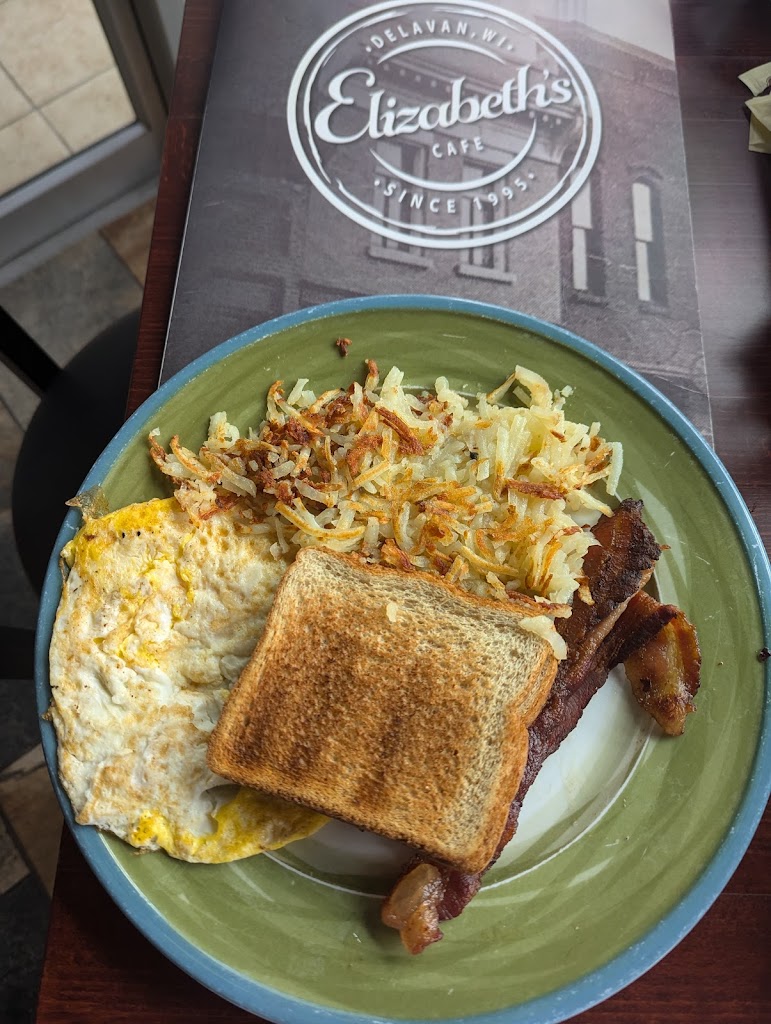 Elizabeth's Cafe is a treasure! The food is delicious, (I had the Swedish pancakes and my husband had the breakfast 2 egg combo-the bacon was AMAZING!) the service was fantastic, and you absolutely cannot beat the price for all you get!! I highly recommend Elizabeth's Cafe-we will be repeat customers next time we're in Delavan!!