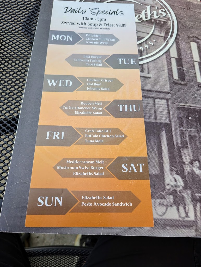 The only problem I have with Elizabeth's is that their prices are ridiculously low! Very friendly and a popular location for breakfast and lunch.