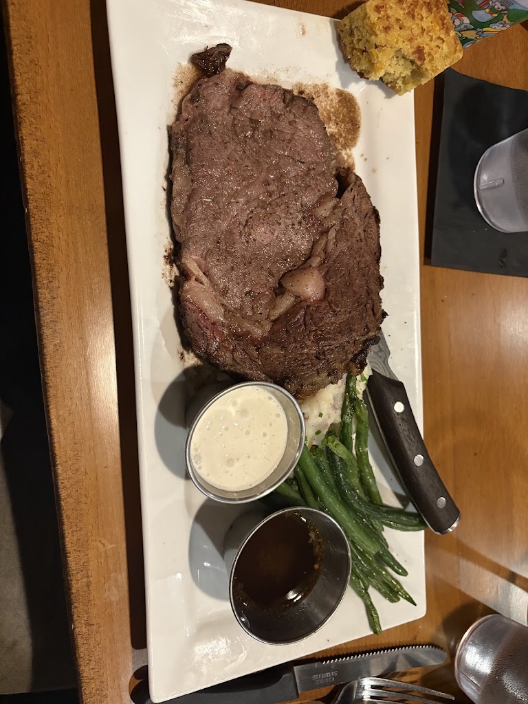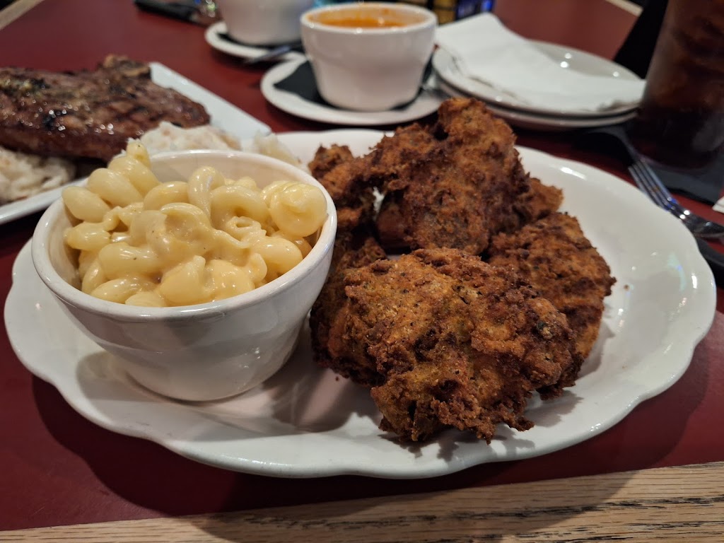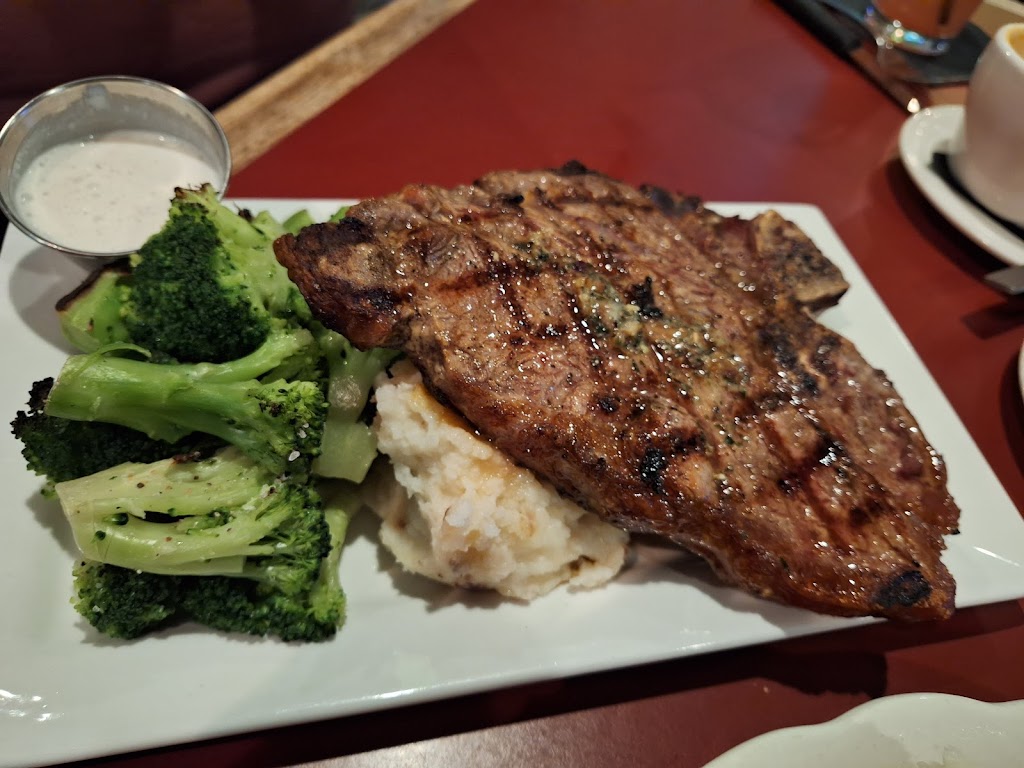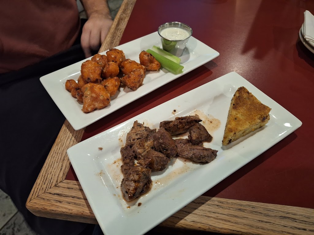We ordered the cauliflower wings app as well as the steak bites, and for entrees went for a porterhouse for them and fried chicken for myself. The apps and sides were fantastic! My wings were perfect and crunchy and the parm garlic sauce was lovely. Their steak bites were juicy and flavorful and the cornbread it came with was great as well. The tomato soup was also flavorful and clearly made fresh.