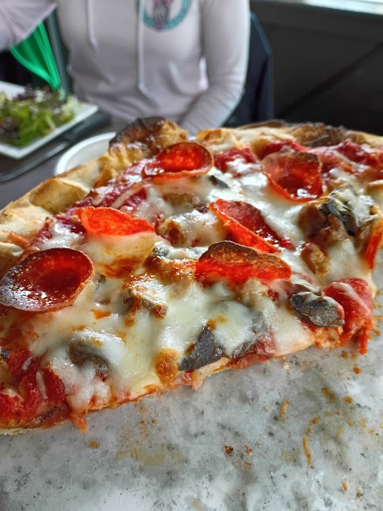 A nice medium size pizza with 2 toppings easily enough for two and two Tall Boy beers including local crafts,......20 bucks. The beers alone usually run $6 each. The Atmosphere is the coolest with a fire lounge, big bar, and lighted atrium.