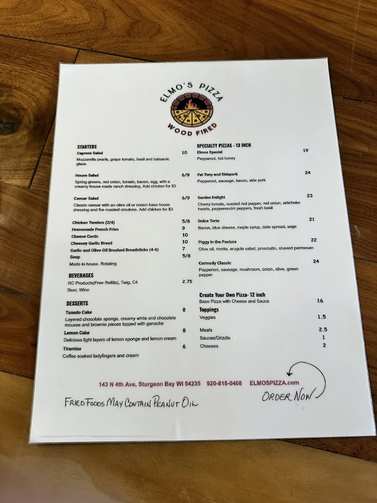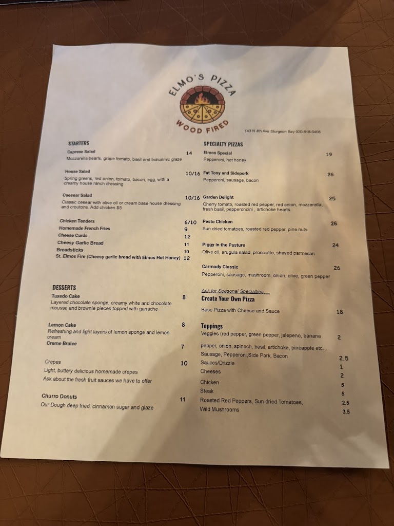 Elmo’s wood fire pizza was excellent, as was the service and atmosphere! This is Sturgeon Bay’s hidden gem! The only suggestion I would make would be to get a new sign and advertise on social media about how great you really are!♥️🍕♥️