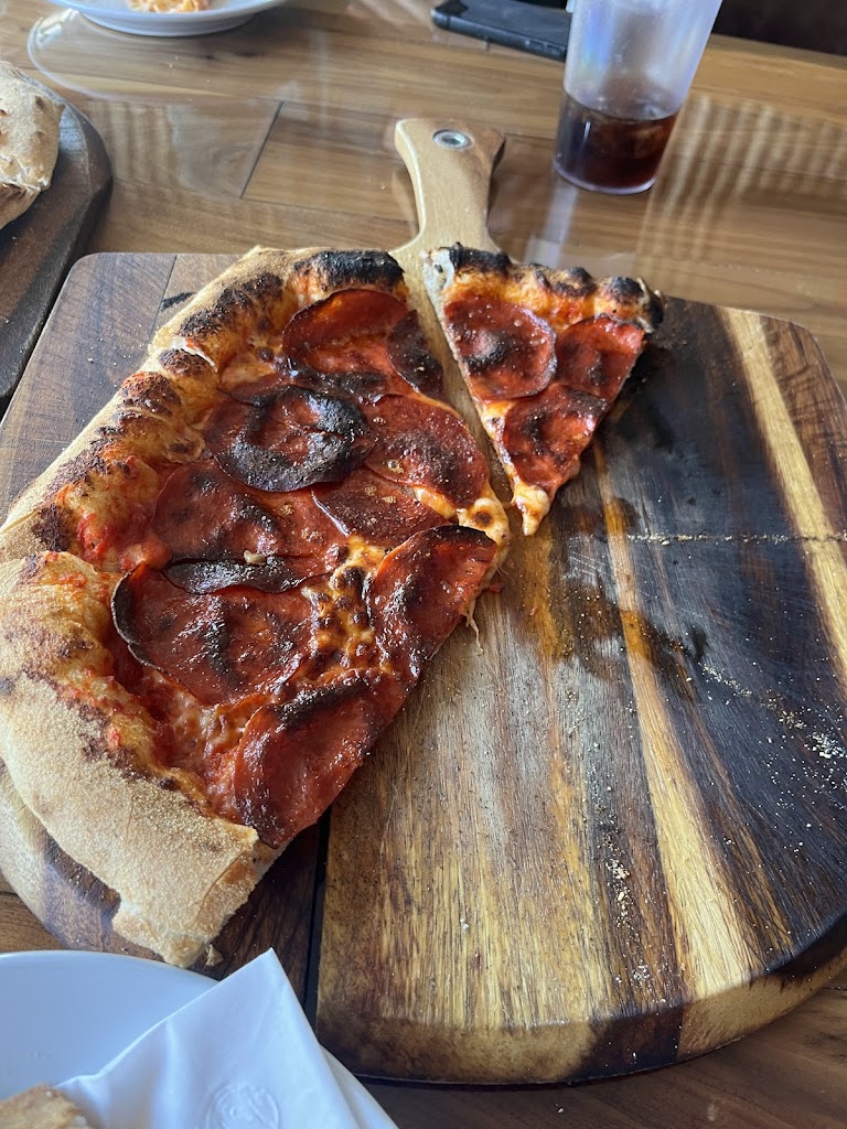The pizza crust is thin but has enough body to hold the toppings and has a touch of char on the crust from the wood fire oven, which tastes great and looks amazing. Sauce is flavorful with a touch of tang and just the right amount on the pie. I saw a salad go by that looked really good, which I will try next time. If I lived here this would be a weekly visit. I know they recently opened, and I wish them all the best.