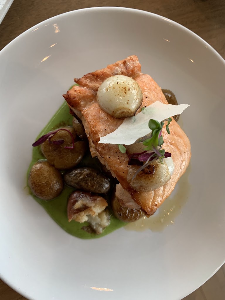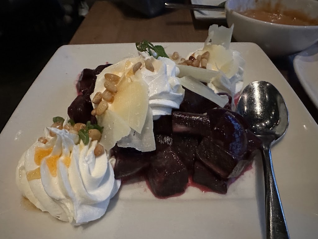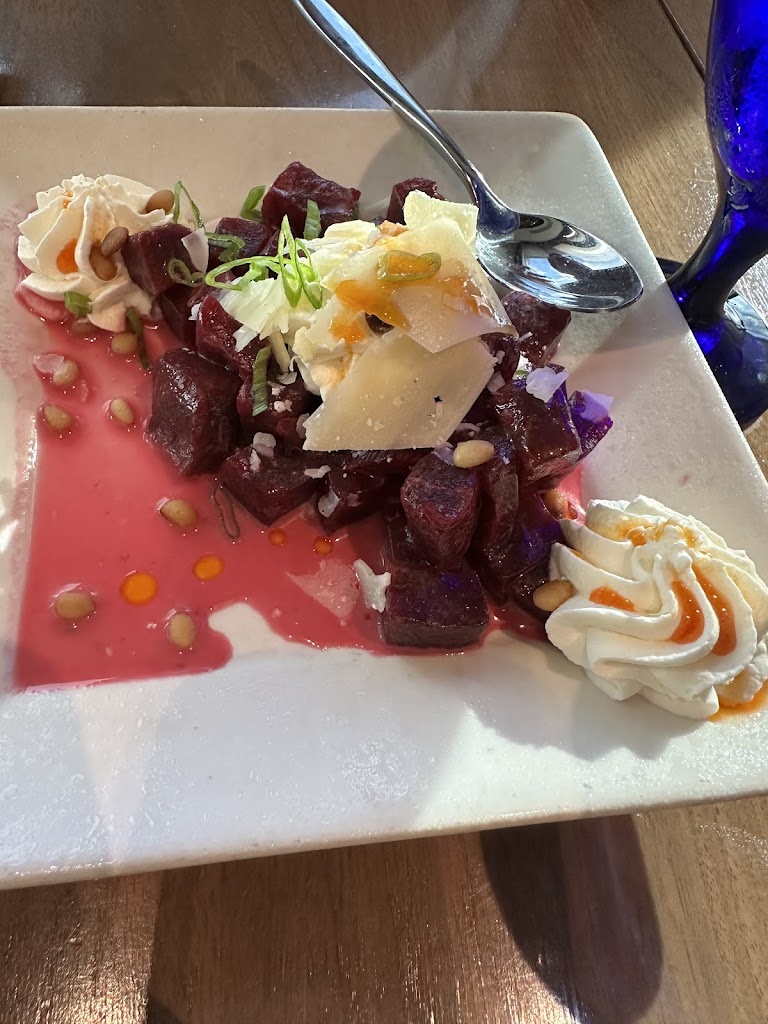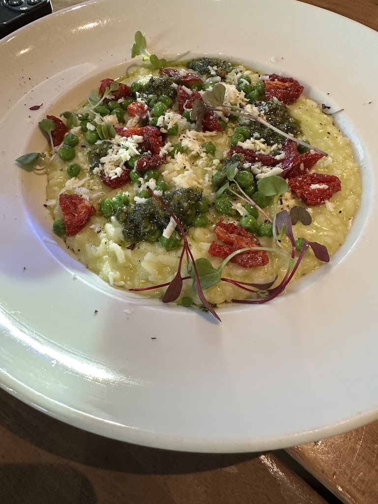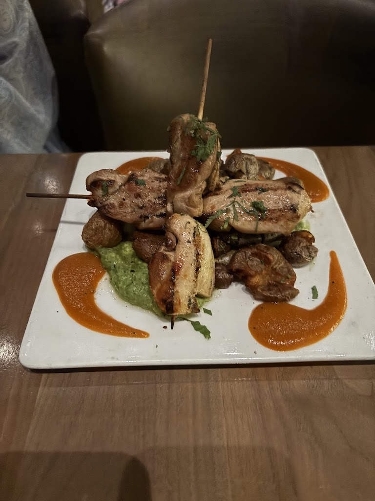 Salad green with apples and grapes topped with prosciutto and a light vinaigrette that tied it all together . Very light and a good start . Roasted beets were well prepared and goat cheese on the side also nicely balanced and light . The pistachio& pea risotto although it looked heavy was not as rich as one would expect but had the right amount of ingredients to not make it too heavy . Really enjoyed this . Finally the chicken thigh kebabs with smashed fingerling potatoes and an avocado thick purée sauce was a good dish .
