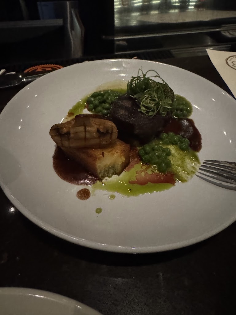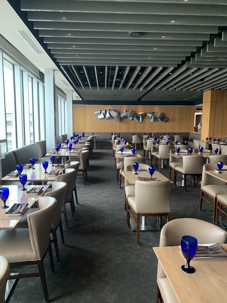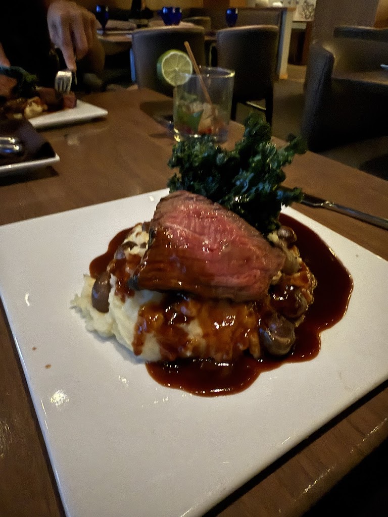 The atmosphere and views are amazing. The menu is also way over the top. My experience was different than many of the reviews. I sat at the bar. Ordered a $24 9oz glass of Chardonnay. Also ordered the filet and soup as a starter. The soup came out with the steak at the same time. The bartenders both nights didn’t send the soup out first. It seemed like the kitchen ran out of salt and pepper. Everything was under seasoned. The soup was watery and needed salt and pepper. It had no flavor. The steak remarkably had no salt or pepper on jt. It was ordered medium but came out a solid mid-rare. It was a chewy steak with cartilage running through it. This was NOT a $65 steak. The steak at Texas Roadhouse is more consistently tender. The side potato was the size of 2 steak fries. (And also had no seasoning). The little piles of peas had no flavor. They’re trying too bard to justify the super high prices. Even for a hotel restaurant.