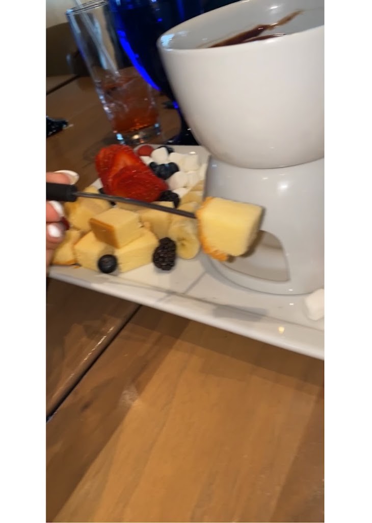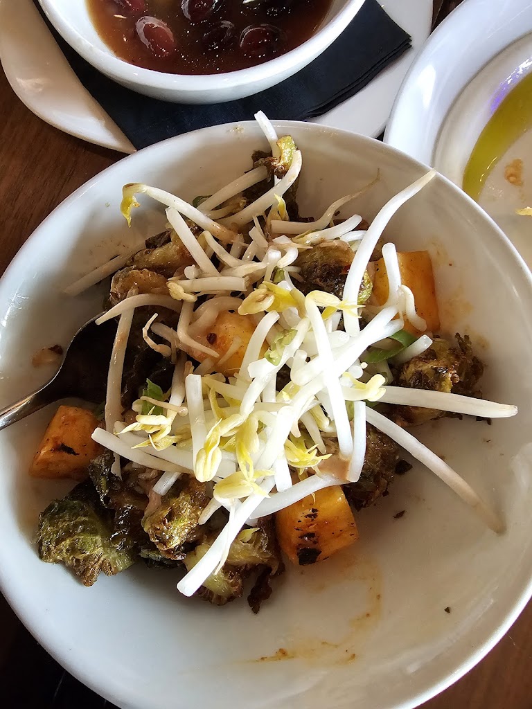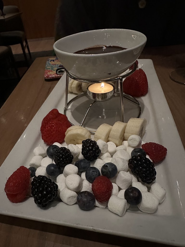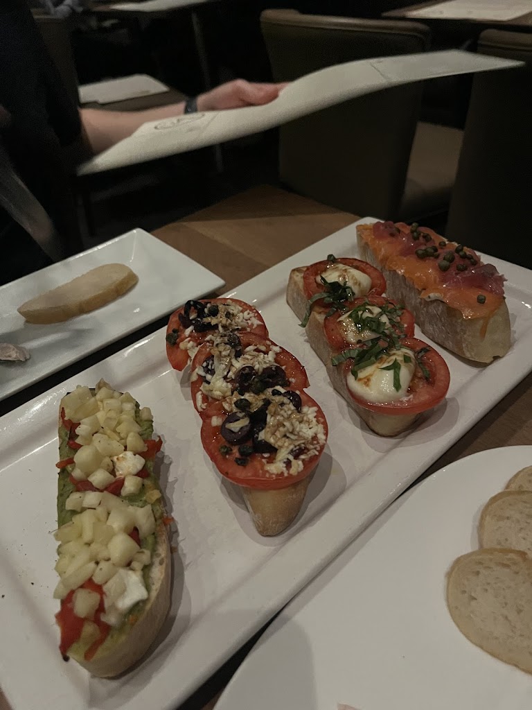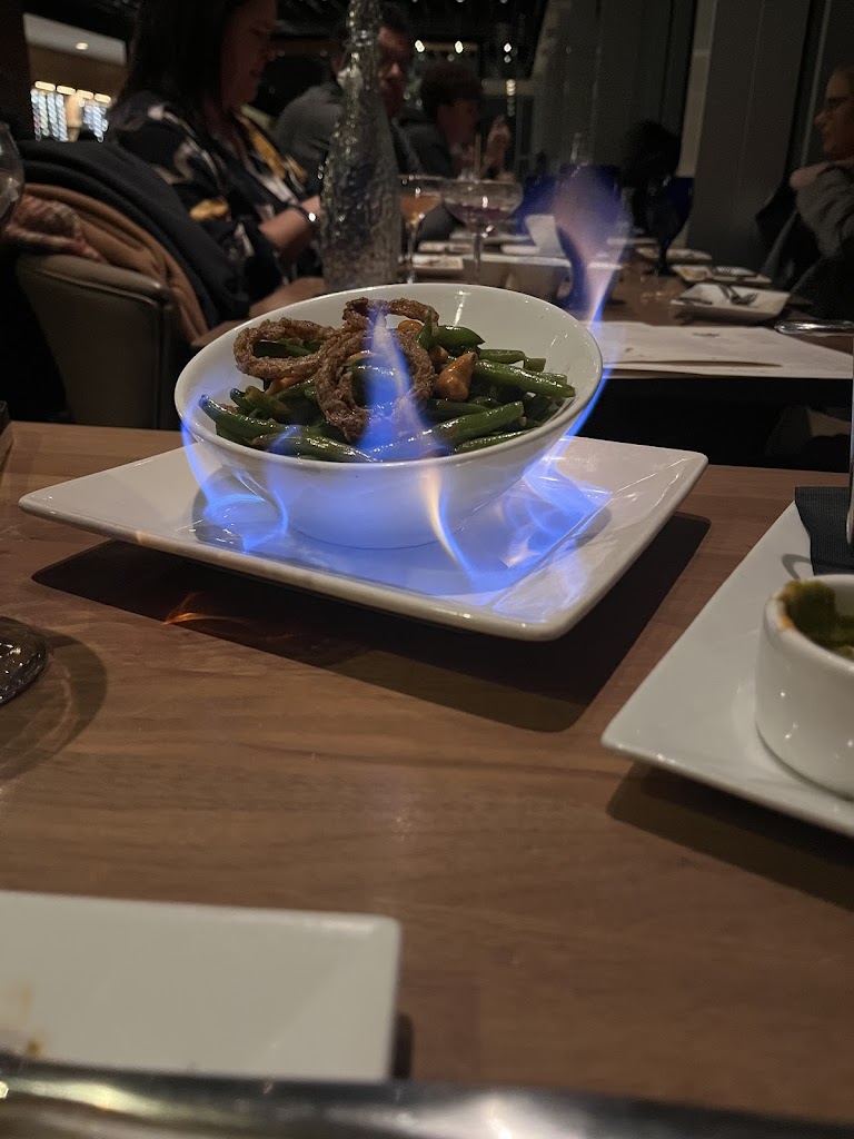 We started with the cheese plate and some bruschetta. Highly recommend the “bruléed”goat cheese. Others were good. That one was delicious. Best bruschetta was the salmon. We then had the green beans flambé, the calamari fries, the Brussels sprouts and finally the pumpkin spice risotto. We loved everything except the risotto, which was too sweet and not a flavor that we liked. We ended with the chocolate fondue dessert.