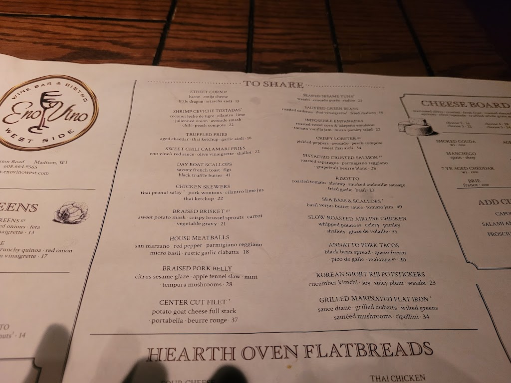 Amazing sumptuous food. Everything from truffle fries to butter cake dessert was really good. Service is good. We were clearly told when the kitchen would stop taking orders and what our alternatives were for the late night. The balsamic reduction on the roasted vegetable flatbread was pretty yummy. Impossible empanadas were in completely different league. Butter cake and mint gelato was a perfect end to a long trip to Madison. Very happy that we decided to splurge on a dinner at Eno Vino.