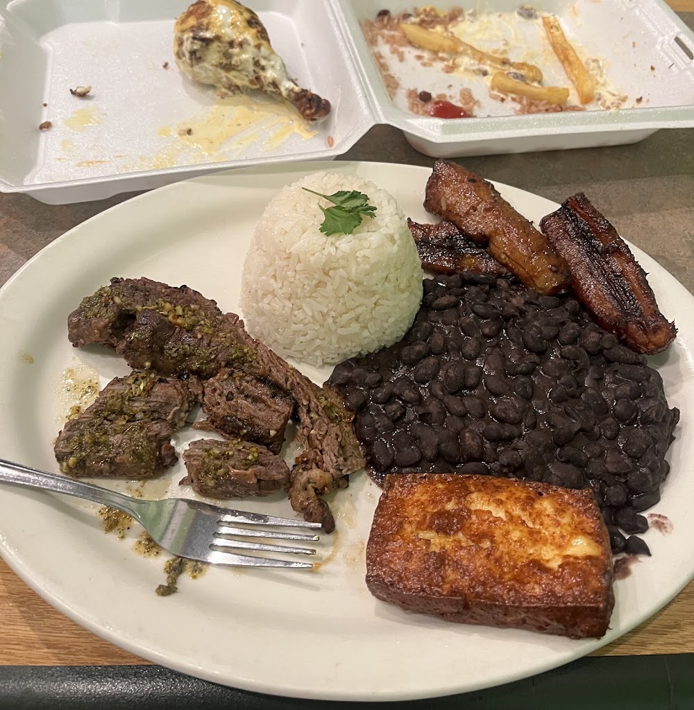 Fuy a comer un arroz Gallo Pinto con Chuletas Guisadas y Plátanos maduros muy rico lo recomiendo