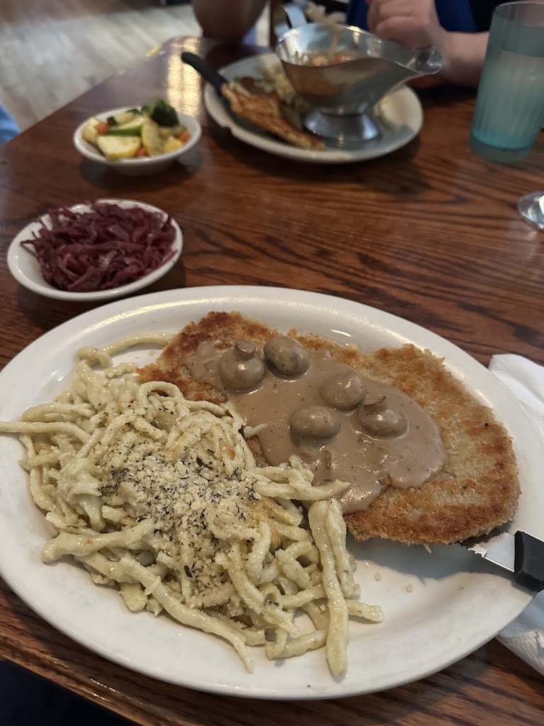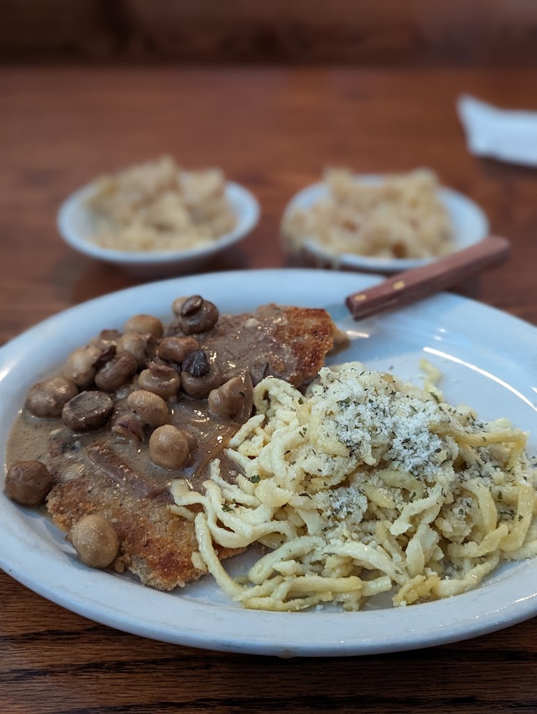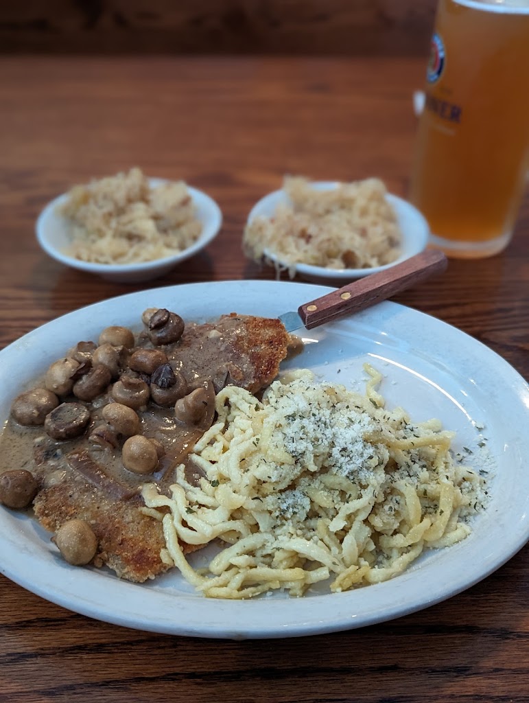 The jaegerschnitzel and spaetzel were awesome and the kraut was delicious. Oh, and the mustard with the pretzels was sooo good. The horseradish was off the charts! Just the way it should be.