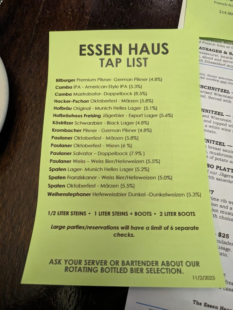 My friends and I recently had the worst experience going to Essen Haus. The waitresses were downright rude. She was constantly walking past our table shaking her head, talking to other servers looking over to us, insinuating she was talking about us. She had even followed us outside to see what we were talking about. The pretzel was cold and lack luster. I’m really disappointed as a fellow server.
