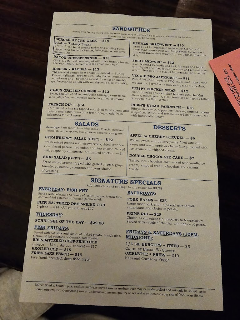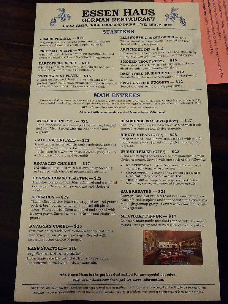 The Essen Haus is a German restaurant with traditional German cuisine. The prices are surprisingly cheap for today's standards, especially for a restaurant downtown Madison.