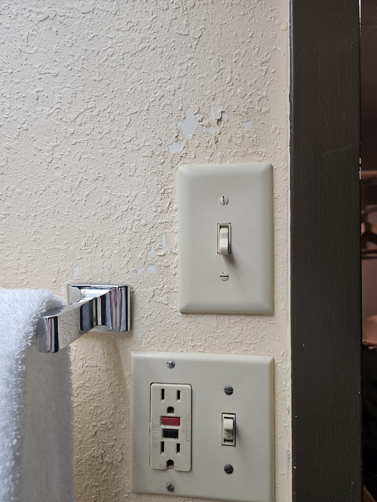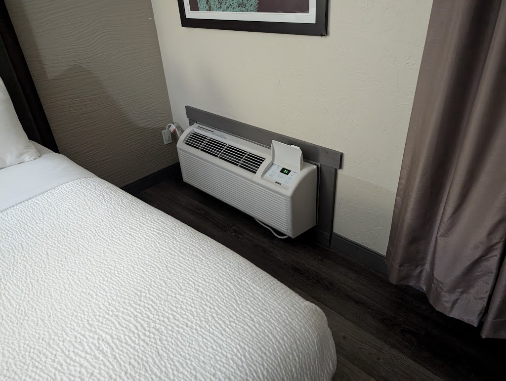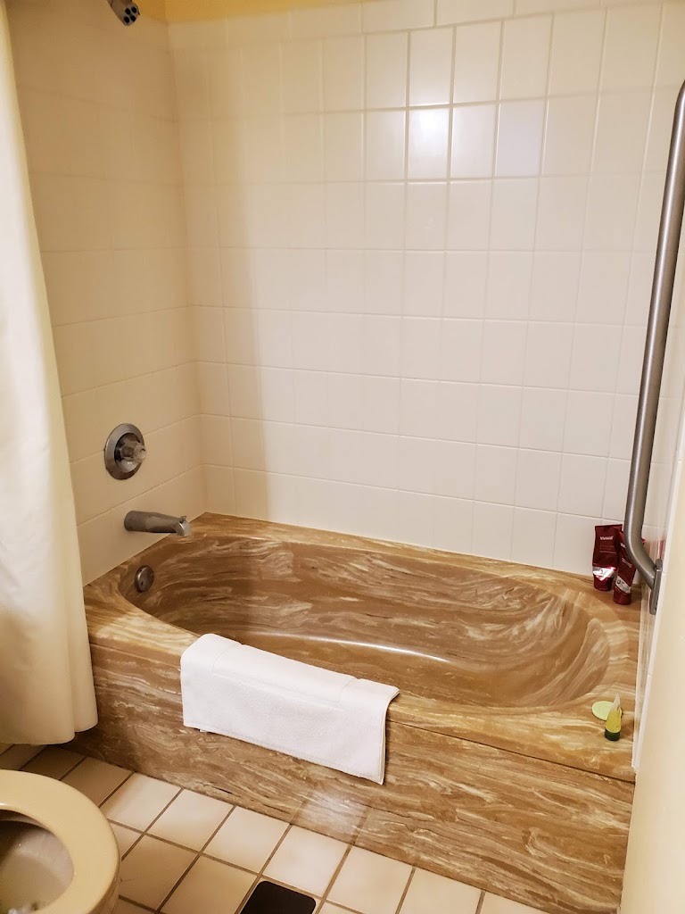 Oh boy, only one of the two bedside outlets worked, and no separate phone charger so hopefully you don't have 2 things to plug in. The room smelled like wet Doritos, but not surprised with the pool right there. The bathroom floor was so dirty it was 3 different colors and I think that was rust on the tissue box, but I didn't feel like touching it to find out. The freezer in the mini-fridge needs to be defrosted-badly! Tried watching TV but the strip of pixels that was missing in the middle of the screen was kind of distracting and it only had basic satellite channels. Don't leave at night, or during the day for that matter, you can barely make out the parking lot lines so parking was a little....crooked. We went to breakfast the next morning....once we found it. No signage and we were barely told about it at check-in. The food was cold and the chairs were cracked/broken.