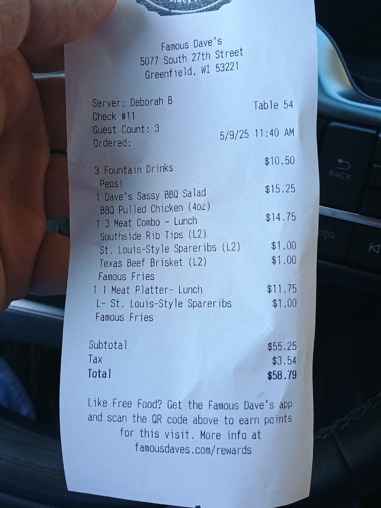 I recently dined at Famous Dave’s after a long time away, and I wanted to share my feedback on the experience. I was pleased to see that the restaurant appeared much cleaner and well-maintained compared to my previous visit. However, my overall experience was disappointing.