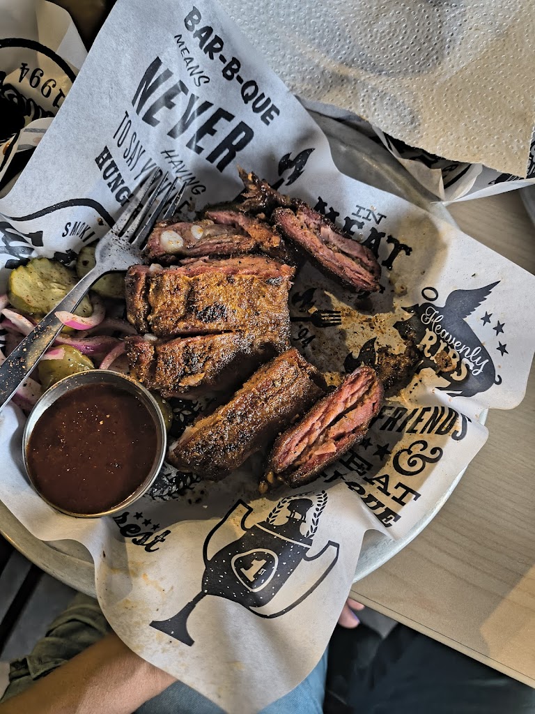 I just spent 35 dollars for a 3 meat plate. My brisket was chewy and had a lot of fat on it. I know it’s 6 pm but my food tastes like it’s two days old bbq. It’s not worth it.