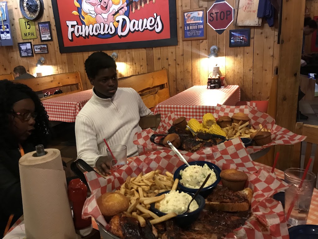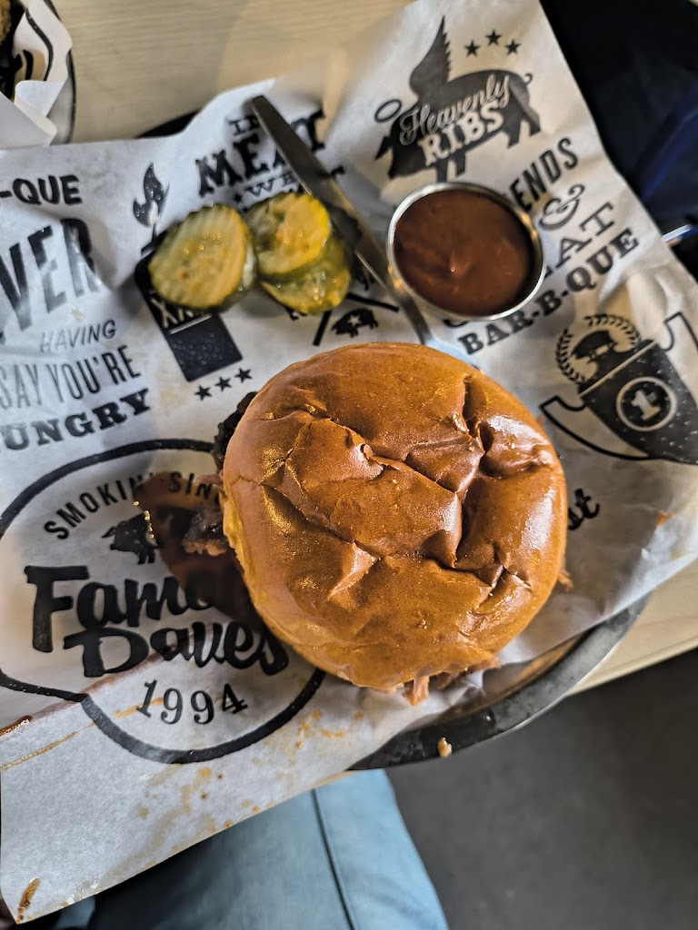 The service was mediocre; our server did not seem attentive. For example, my drink was served in a broken cup that was leaking immediately, and I had to flag her down to get a replacement. When our food arrived, most of it, including the sides, was cold. The ribs, in particular, had an unpleasant taste that was very different from the classic Famous Dave’s flavor I used to enjoy. Additionally, the sauces and sides were underwhelming, lacking the quality I remember.