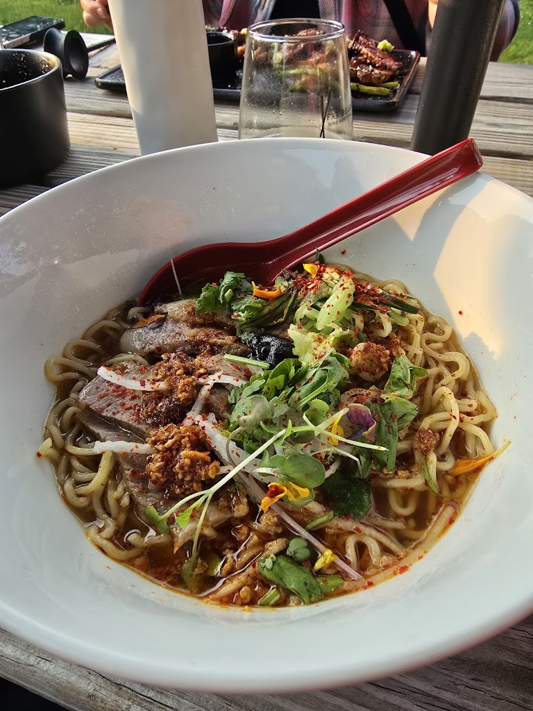 Our first visit and loved everything about this place. Itβs a very small venue with a cool vibe, impeccable hospitality and service (thank you Ali), and a varied Asian inspired menu. We enjoyed the crispy beef appetizer and the pork belly ramen and βsamuraiβ (chicken and pork belly) bowl. I asked for the dragon broth with my ramen and it was about a 4-5 on the spice scale, excellent! Also enjoyed wine and their sake sampler. This will be our new go-to restaurant in Door County, which is starving for (no pun intended) ANY kind of Asian fare. Would like to see at least one Thai curry dish please.