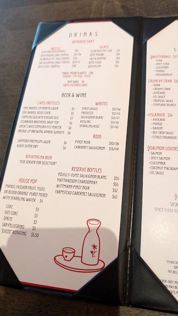 We were able to do carry-out on a less-busy Thursday night. Sushi rolls were excellent (Godzilla 2.0 & Crunchy Crab) Entreeβs were great as well (Samurai Bowl & Pork Belly Ramen) Ramen was on the saltier side but overall very good.